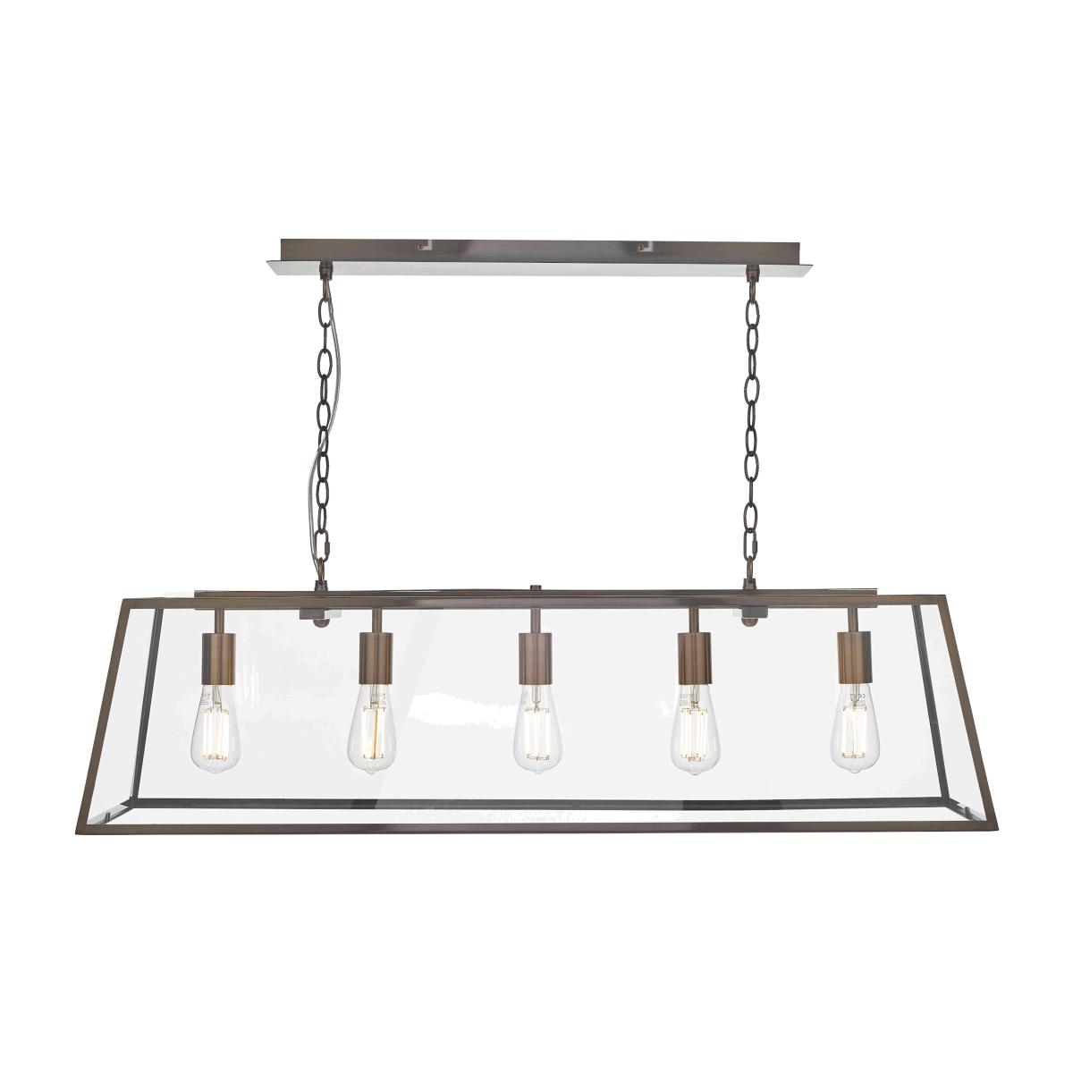 Bold yet elegant, this bar ceiling pendant with a matt black metal finish and five lights behind clear glass panels is a wonderful choice for over a kitchen island or dining table. Why you'll love it Less is more with this simple metal and glass 5-light bar pendant light. Sophisticated industrial style. Matt black metal frame and ceiling plate. Clear glass panels. Accommodates 5 light bulbs. Height-adjustable on installation. This bar pendant light is part of the Furniture Village lighting collection. What you need to know Metal and glass. Supplied with 150 cm of hanging chain. Requires 5 x E27 ES max. 60 W bulbs (not included). Professional installation recommended. Dimensions Height: max. 191cm (76 in). Depth: 30 cm (12 in). Width: 110 cm (14 in).