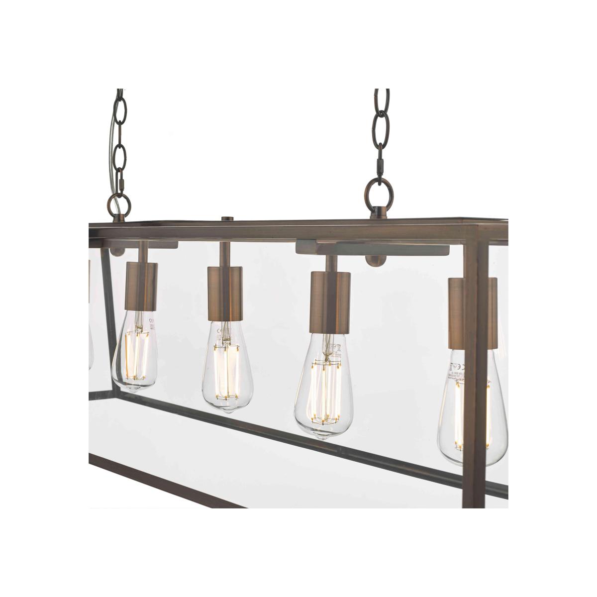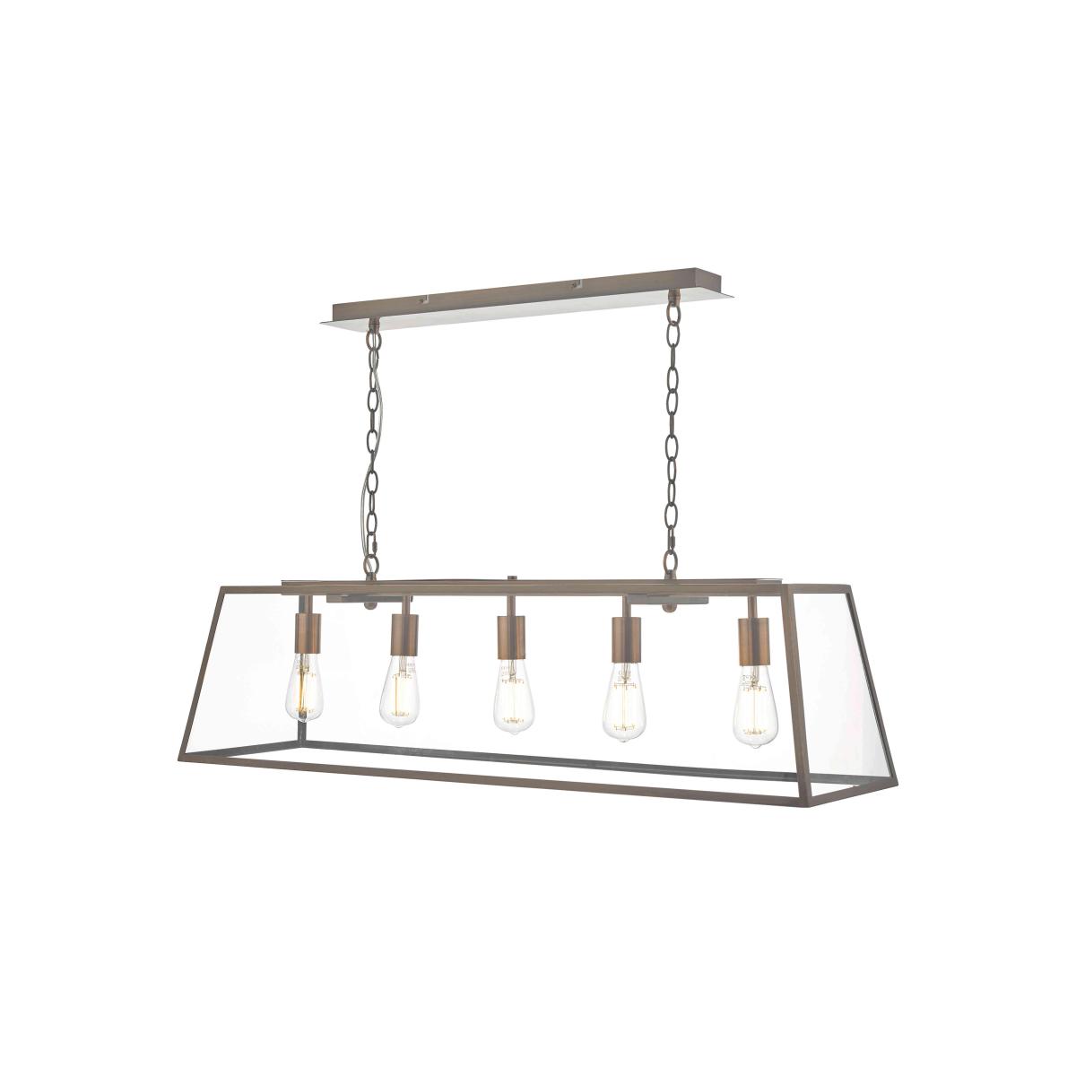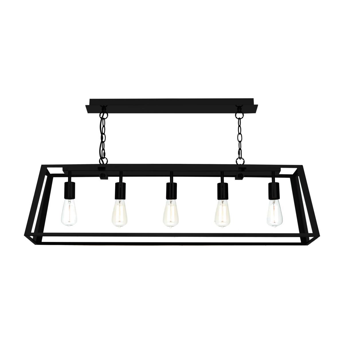 Bold yet elegant, this bar ceiling pendant with a matt black metal finish and five lights behind clear glass panels is a wonderful choice for over a kitchen island or dining table. Why you'll love it Less is more with this simple metal and glass 5-light bar pendant light. Sophisticated industrial style. Matt black metal frame and ceiling plate. Clear glass panels. Accommodates 5 light bulbs. Height-adjustable on installation. This bar pendant light is part of the Furniture Village lighting collection. What you need to know Metal and glass. Supplied with 150 cm of hanging chain. Requires 5 x E27 ES max. 60 W bulbs (not included). Professional installation recommended. Dimensions Height: max. 191cm (76 in). Depth: 30 cm (12 in). Width: 110 cm (14 in).