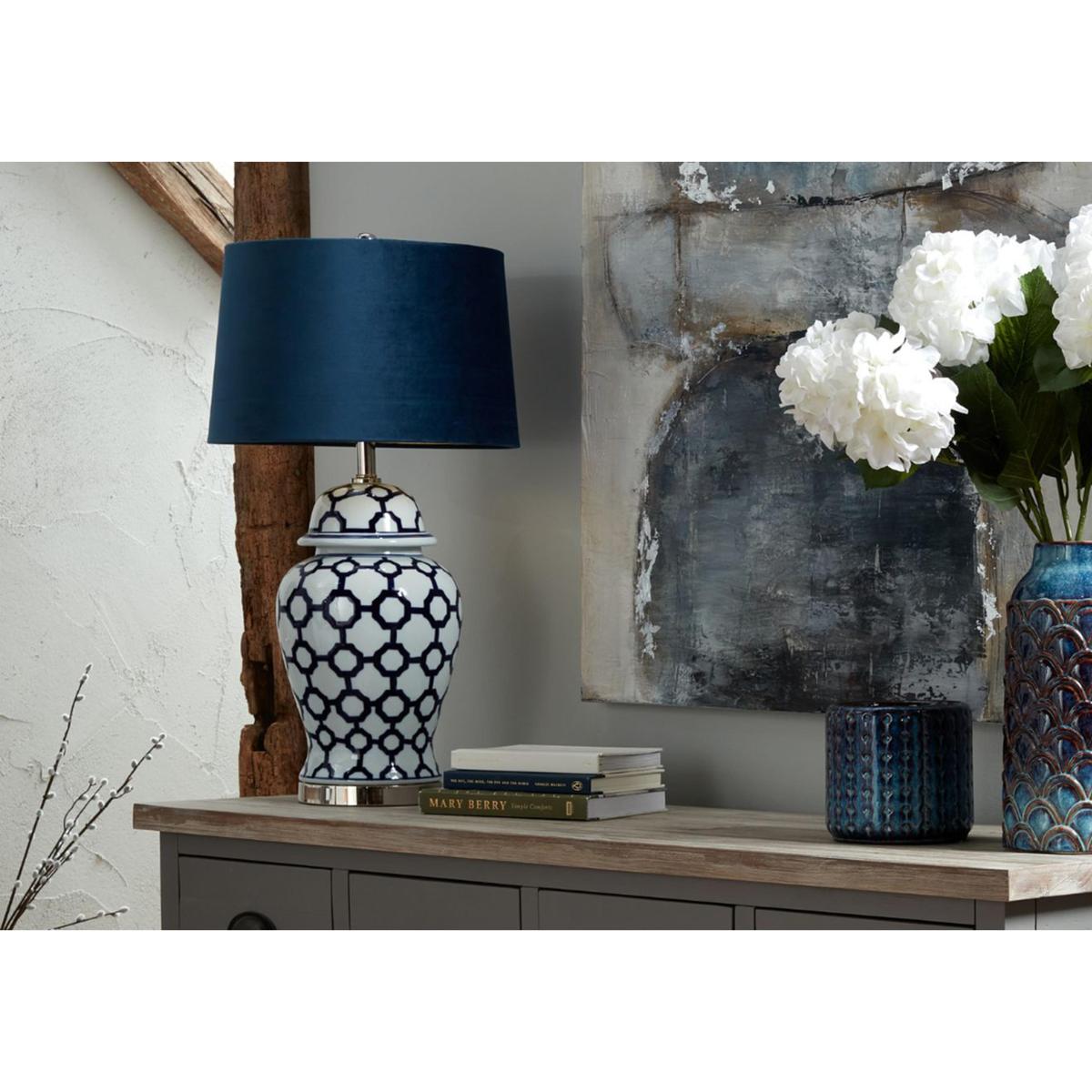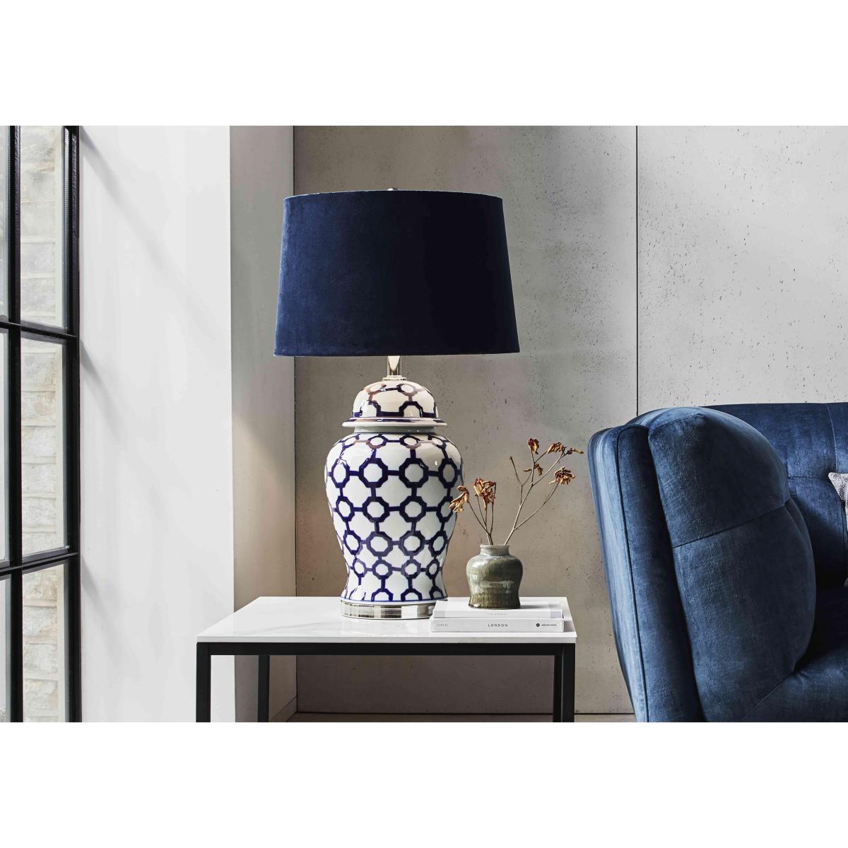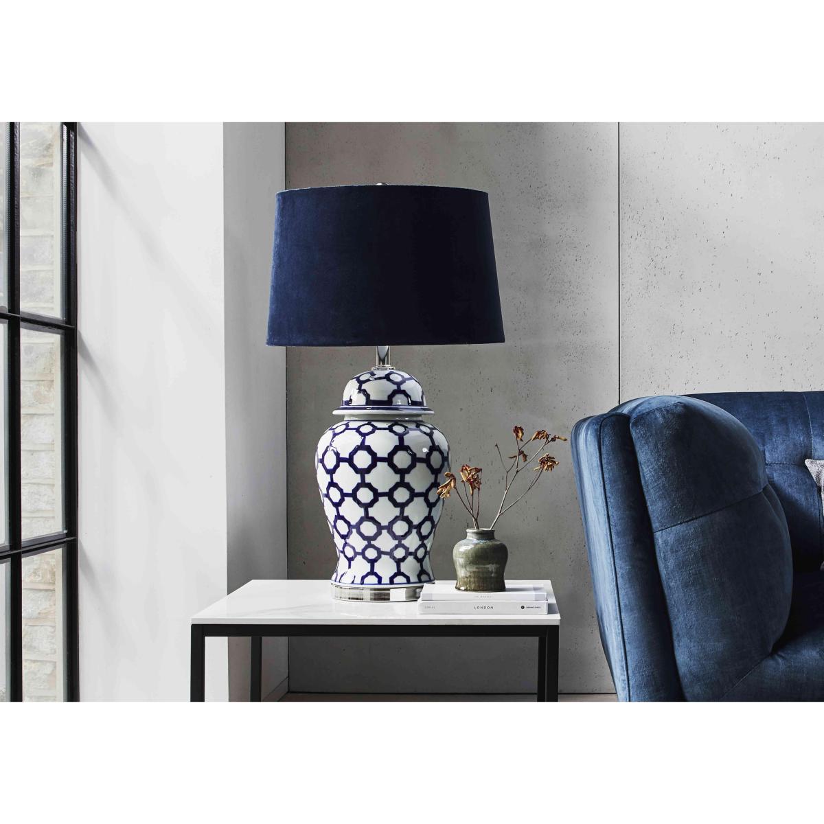 A simple way to add some interest to a room, this table lamp uses a two-tone pattern to great effect. Why you'll love it. A stunning table lamp that brightens any room. A hardy ceramic base means this lamp is more durable. The blue velvet shade adds a touch of elegance. Love this table lamp? Shop our other home accessories. What you need to know. E27 screw bulb fitting. Dust with a soft, clean, lint-free cloth. Dimensions. Width: 43 cm (17 inches). Depth: 43 cm (17 inches). Height: 76 cm (30 inches). Shade width: 35 cm (14 inches). Shade depth: 35 cm (14 inches). Shade height: 26 cm (11 inches).
