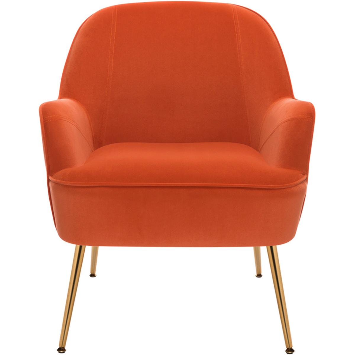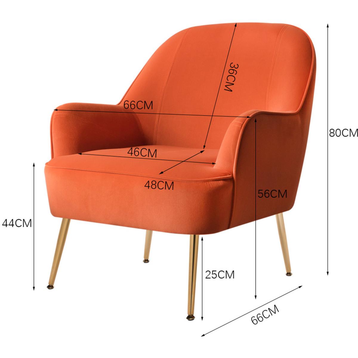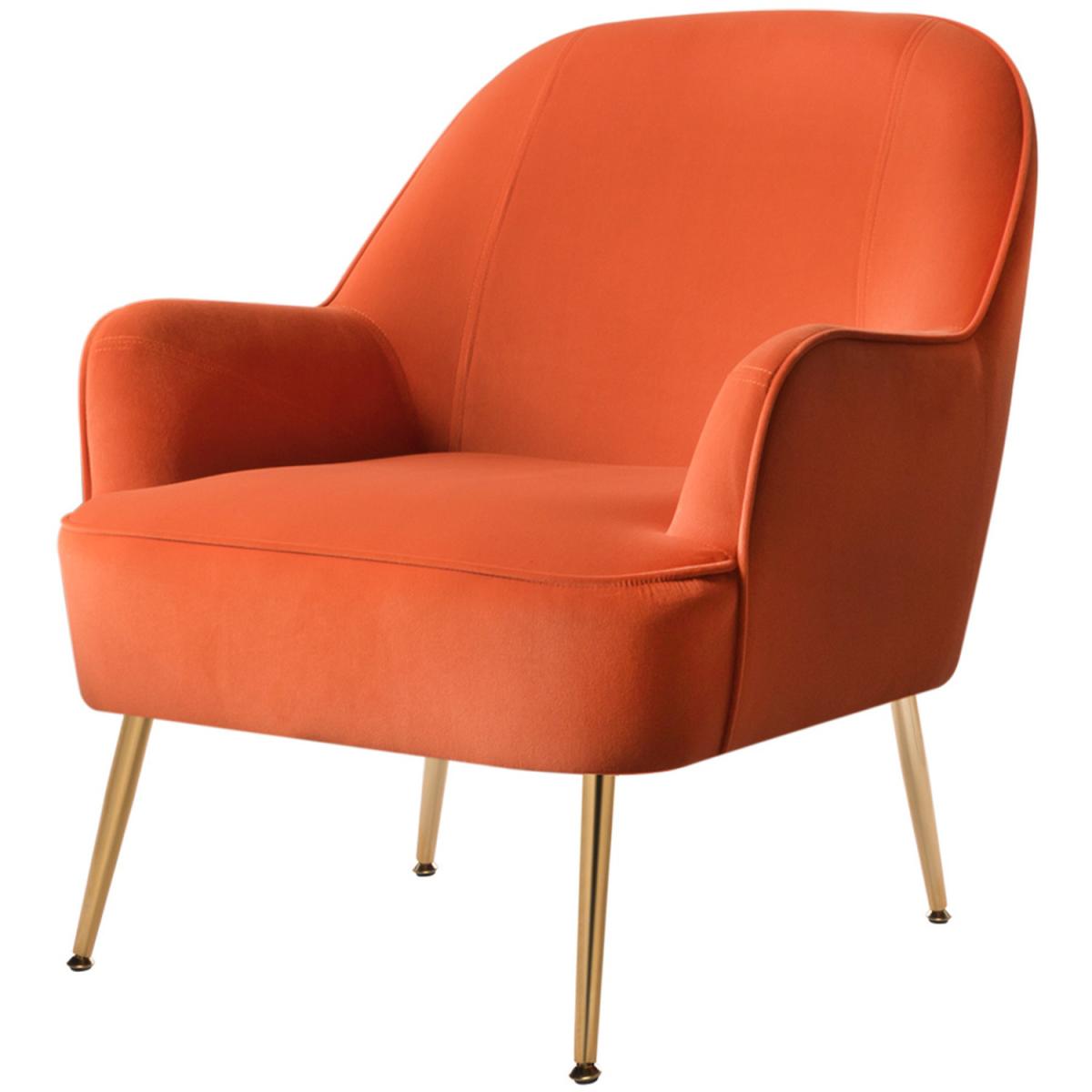 This statement orange armchair is a versatile piece that works well in both contemporary and retro-inspired interiors. I love its bold colour as it instantly injects warmth and personality into a room, making it an ideal focal point or statement accent. It pairs beautifully with neutral-toned sofas or can be used to add a pop of colour to more muted schemes. Practical styling tips include coordinating it with cushions in complementary or contrasting colours, or placing it next to metallic or wood accents for added texture. Its clean lines and tapered legs also make it suitable for smaller spaces, where it can serve as both a stylish and functional seating option.