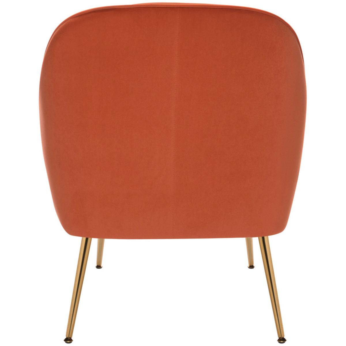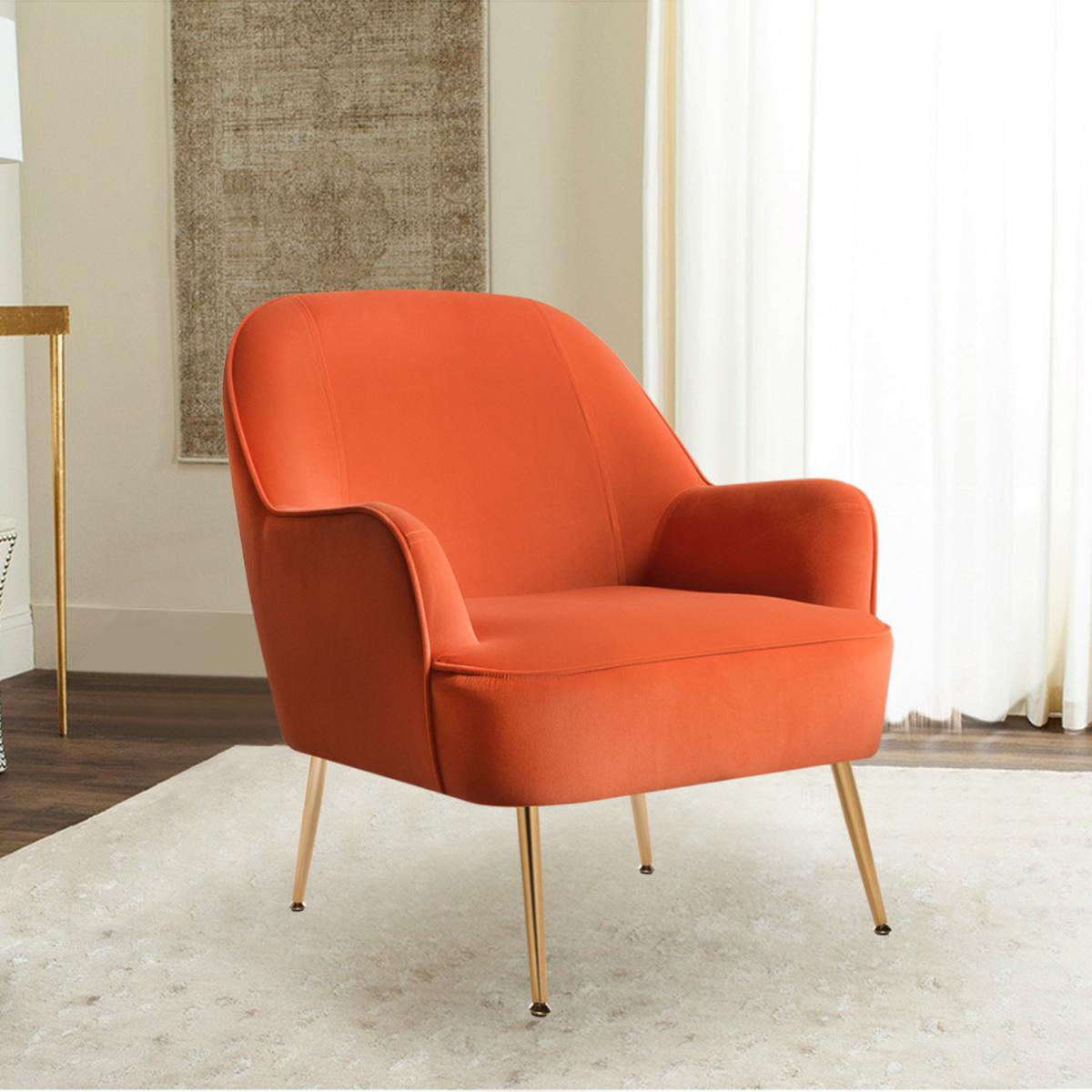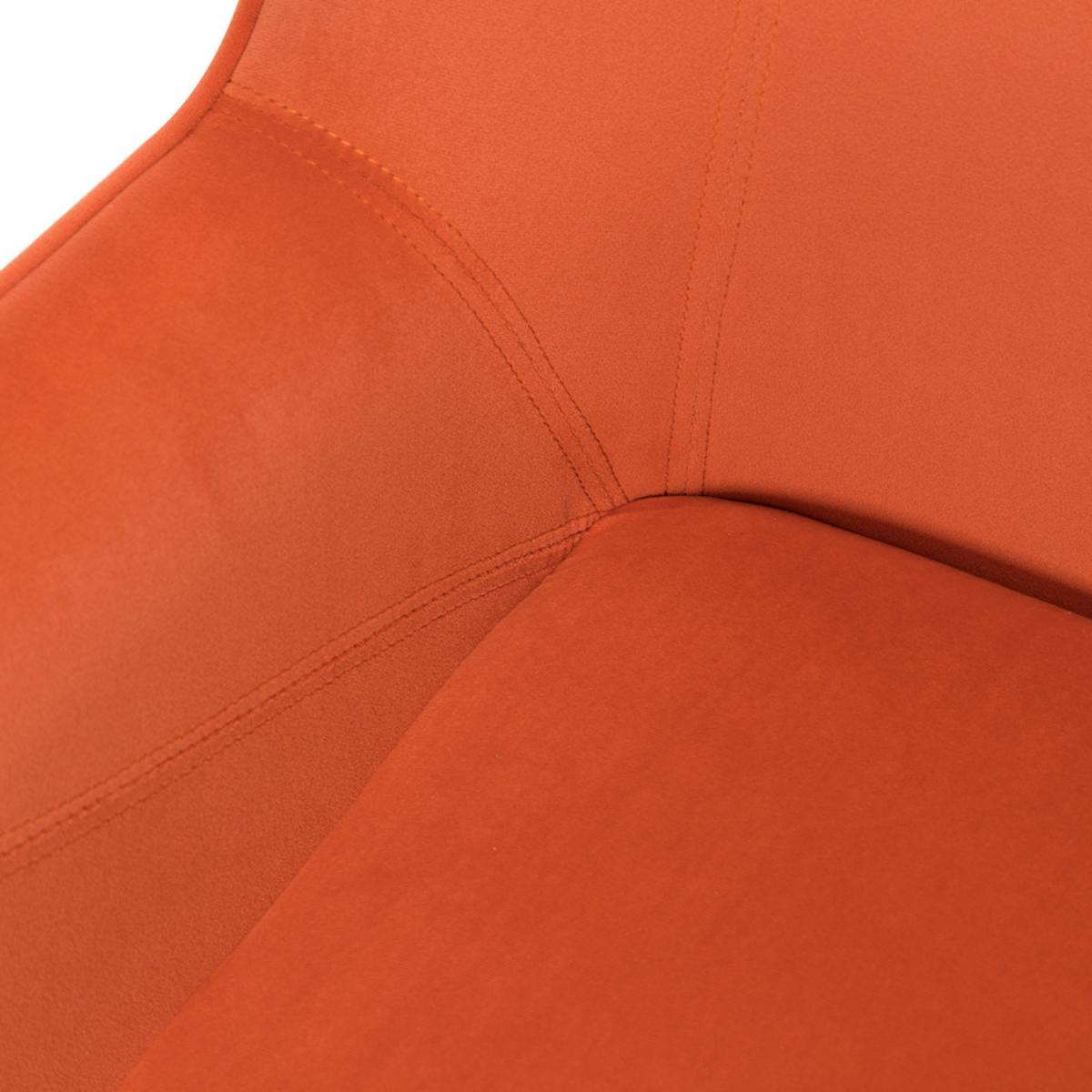 This statement orange armchair is a versatile piece that works well in both contemporary and retro-inspired interiors. I love its bold colour as it instantly injects warmth and personality into a room, making it an ideal focal point or statement accent. It pairs beautifully with neutral-toned sofas or can be used to add a pop of colour to more muted schemes. Practical styling tips include coordinating it with cushions in complementary or contrasting colours, or placing it next to metallic or wood accents for added texture. Its clean lines and tapered legs also make it suitable for smaller spaces, where it can serve as both a stylish and functional seating option.