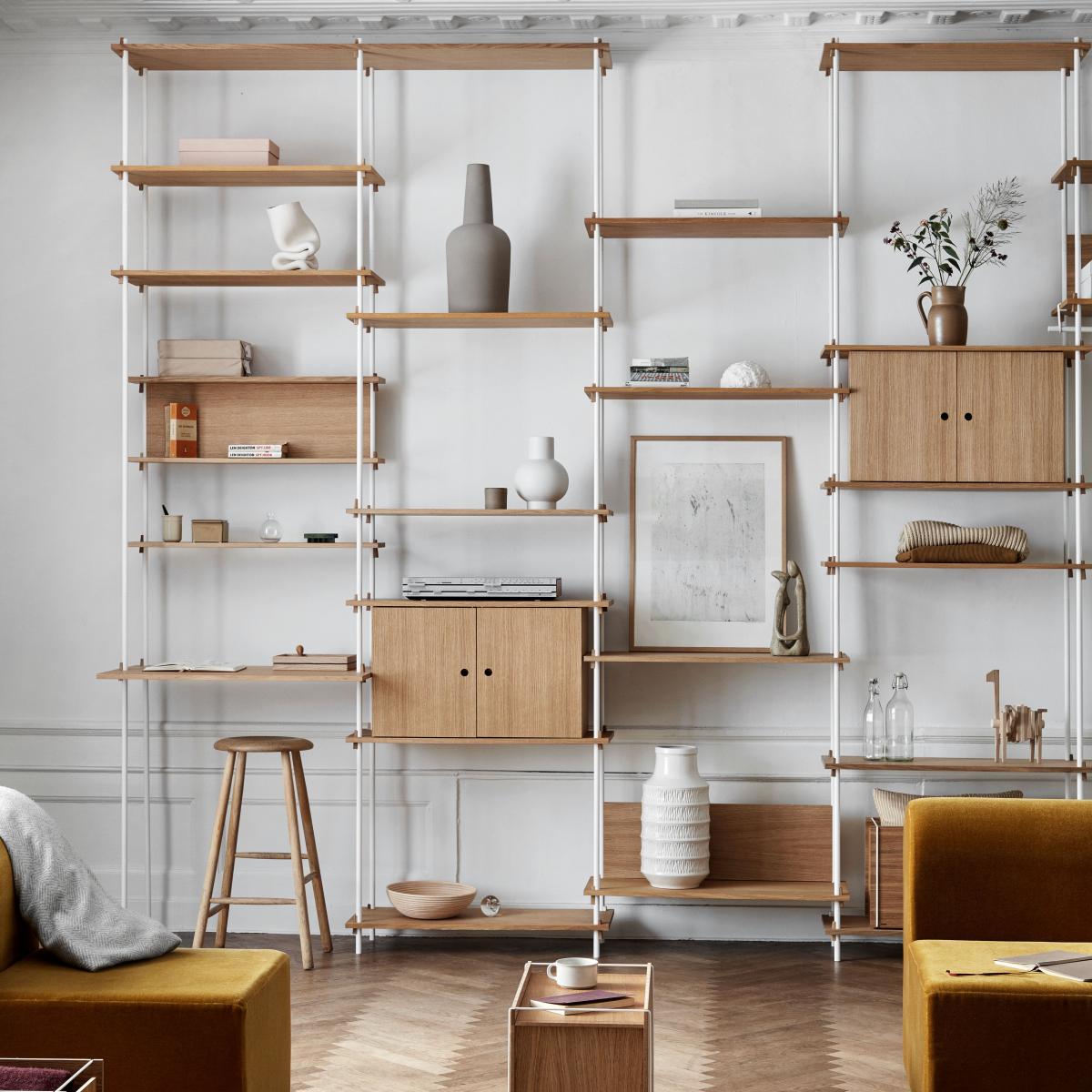 I really like this natural wood crate with doors for the MOEBE shelving system because of its versatile and clean aesthetic. It works beautifully in contemporary, Scandinavian-inspired interiors, adding warmth without overwhelming the space. Practical tips include using it to conceal clutter, as the doors help keep things looking tidy, or styling it with a mix of books, plants, and minimal decorative objects on top to create a balanced display. Its modular nature means it’s flexible-perfect for both living rooms and bedrooms, where you might want a combination of open shelving and concealed storage. Keep the accessories sparse for a modern look, or layer with personal favourites for a cosy feel.
