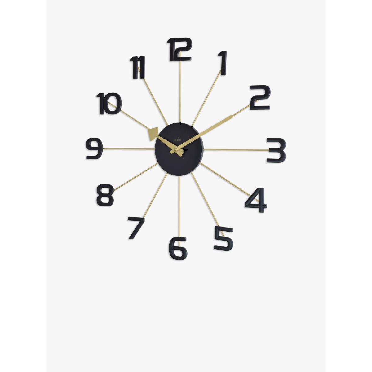 A wheel spoke design, the Astraea wall clock from Acctim has brass markers and clock hands, with an oversized arrowhead hour hand. Finished with contrasting Arabic numerals and a matching black centre, the clock boasts Quartz movement for precision time-keeping.