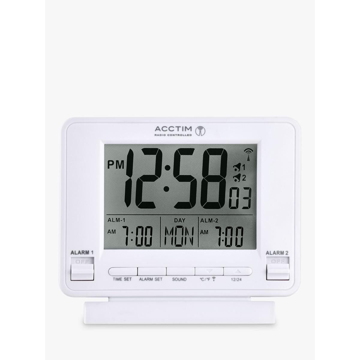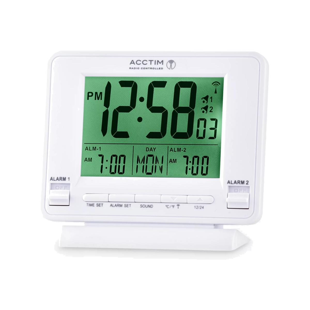 The Delaware Couples digital alarm clock from Acctim has two alarm settings for couples waking up at different times. Ideally sized for a bedside table, it displays the day of the week, the indoor temperature and the time. The display lights up softly for night-time viewing. Using radio-controlled technology, the clock sets up automatically, handily adjusts to summer and winter time changes on its own and keeps time accurately. Two different alarm settings Alarms, day, temperature and time display Radio controlled for accurate time updating