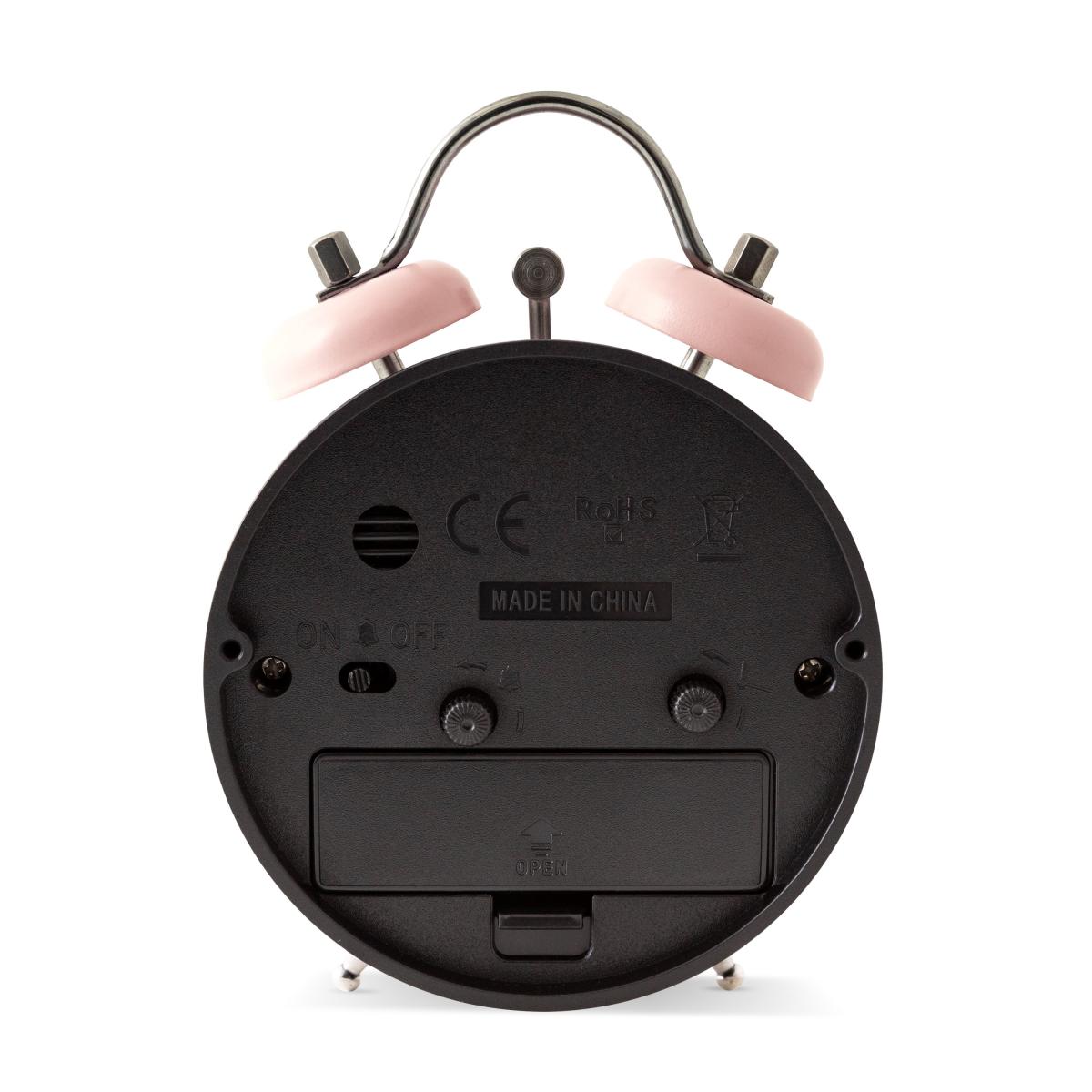 * Numbered analog display* Requires 1 x AA Battery (not included)* Available in a choice of colours* Alarm function Enjoy the vastness of time with this compact faux bell alarm clock which features a beep alarm and metal case.