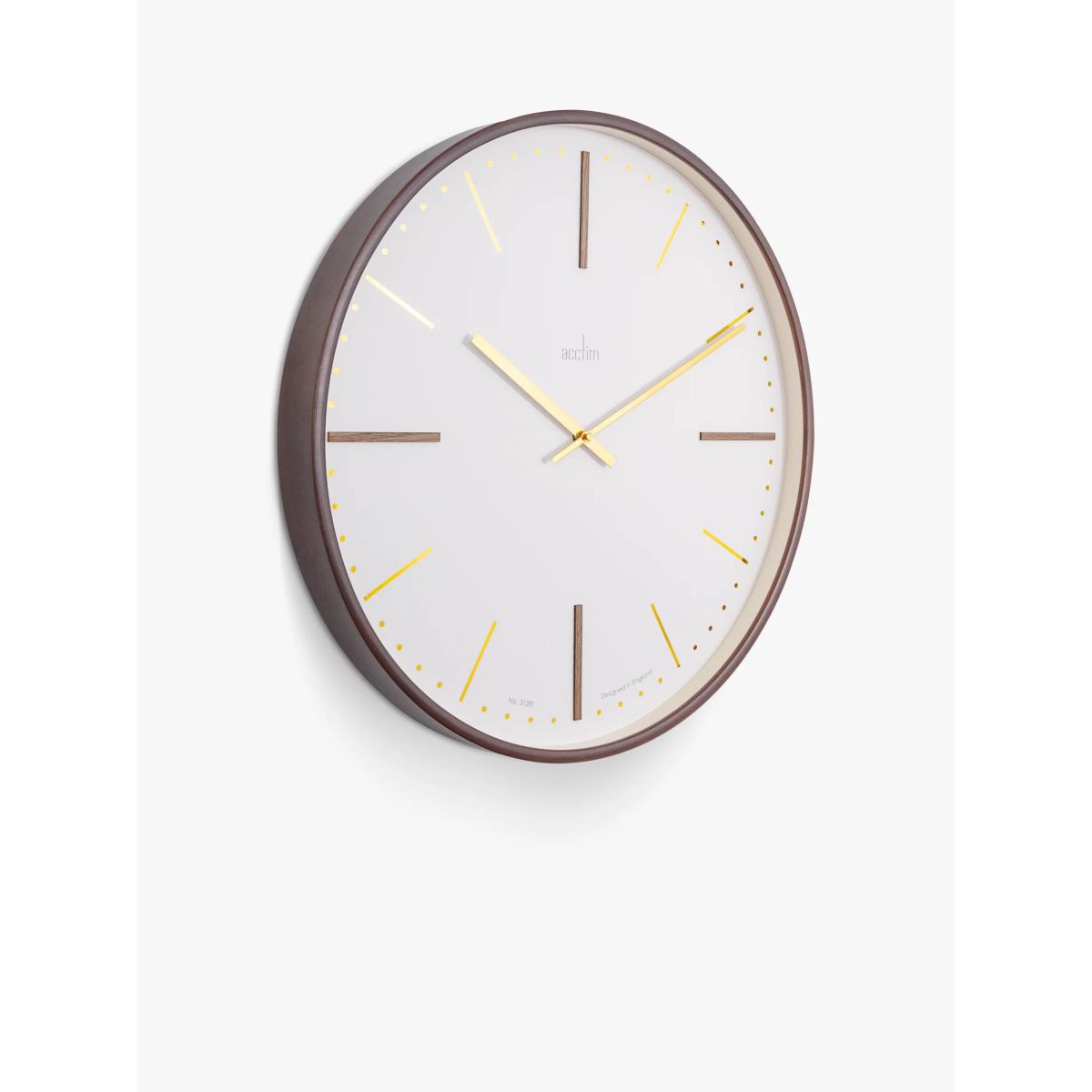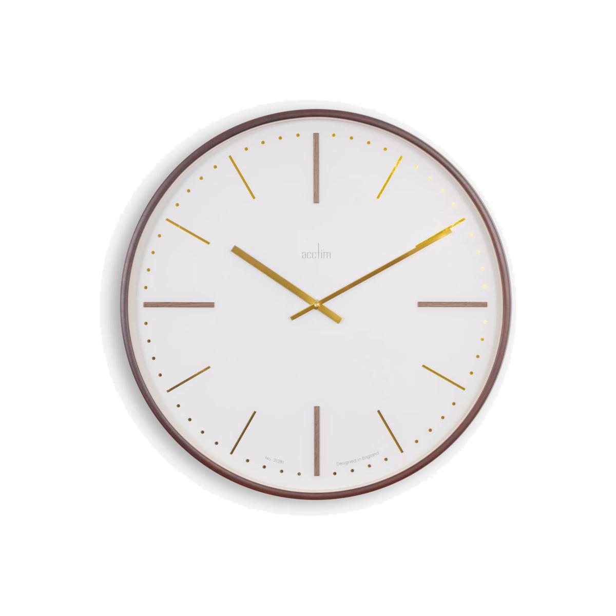 A clock that will take pride of place in any modern living environment, Knoll from Acctim celebrates mid-century modern design. A bent wood case wraps around a minimalist-designed dial, with raised wood batons and a gold foil minute track. This round clock boasts a glass lens and quartz movement for precision time-keeping.
