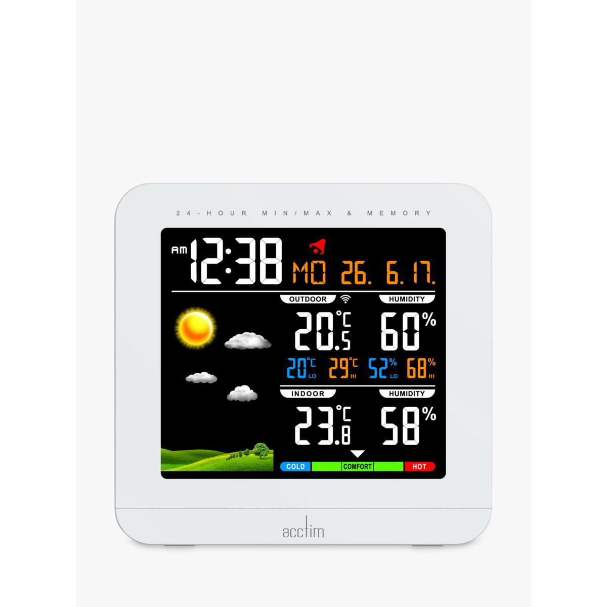 The Acctim Wyndham Weather Station is an alarm clock as well as an indoor and outdoor weather gauge, with an included wireless outdoor temperature sensor. The clever and compact bedside clock has an easy-to-read, high-resolution and dimmable LCD digital display. This shows you the date, time, barometric pressure and weather forecast plus the indoor and outdoor temperature and humidity with cold, hot and comfort indicators. The wireless outdoor temperature sensor can be easily fixed to an outside wall. Showing the current and next-day weather, the Wyndham has animated cloud, sun, rain, frost and snow icons. The weather station is battery powered or mains powered with an included USB cable and socket for charging up.