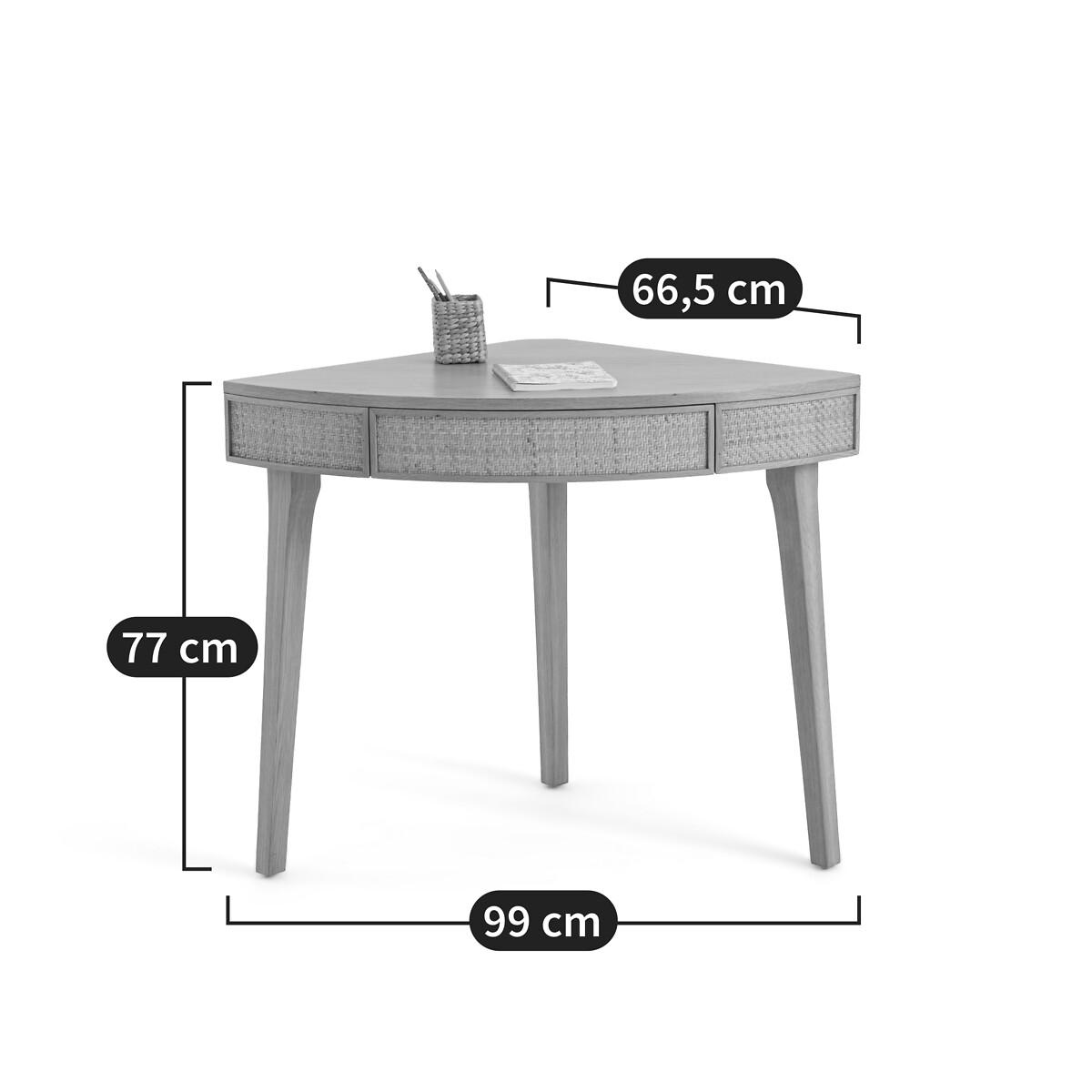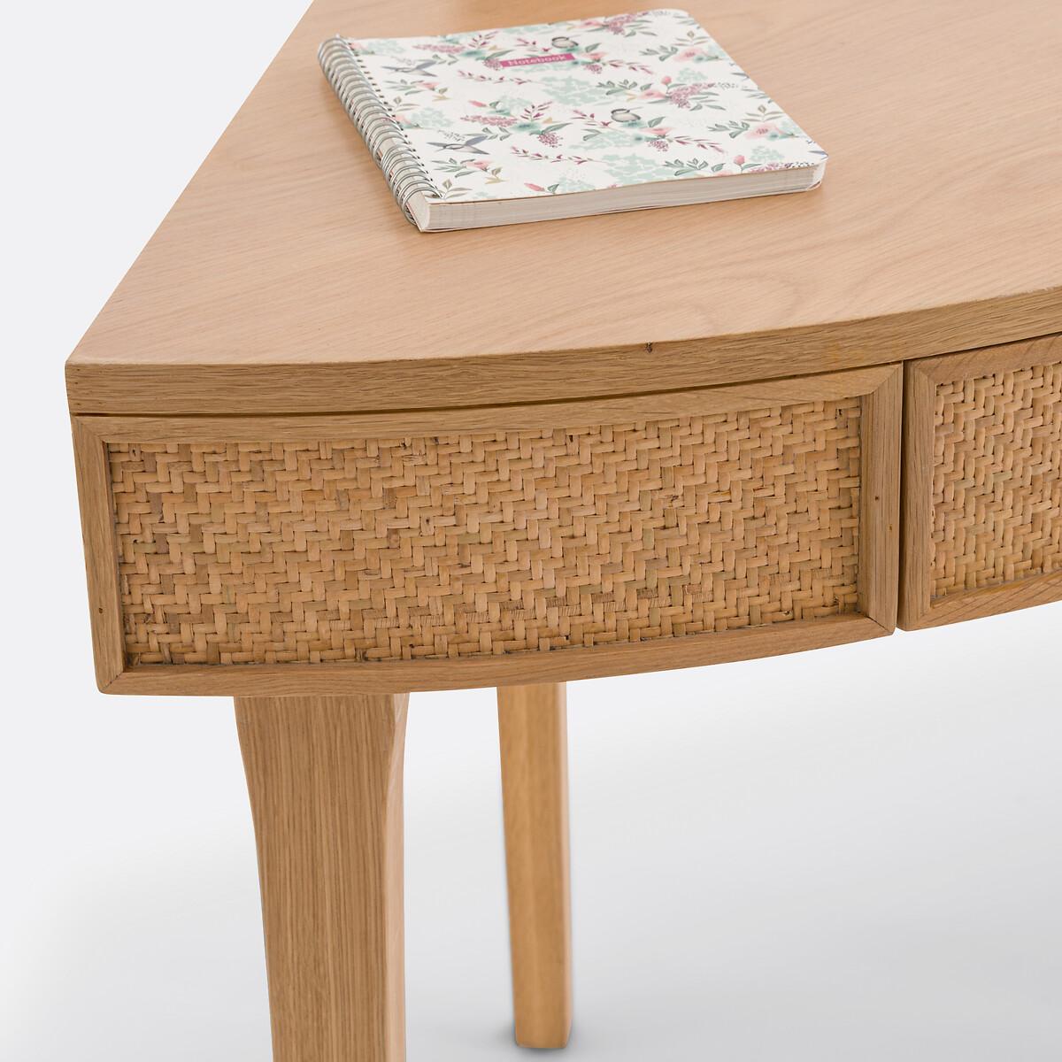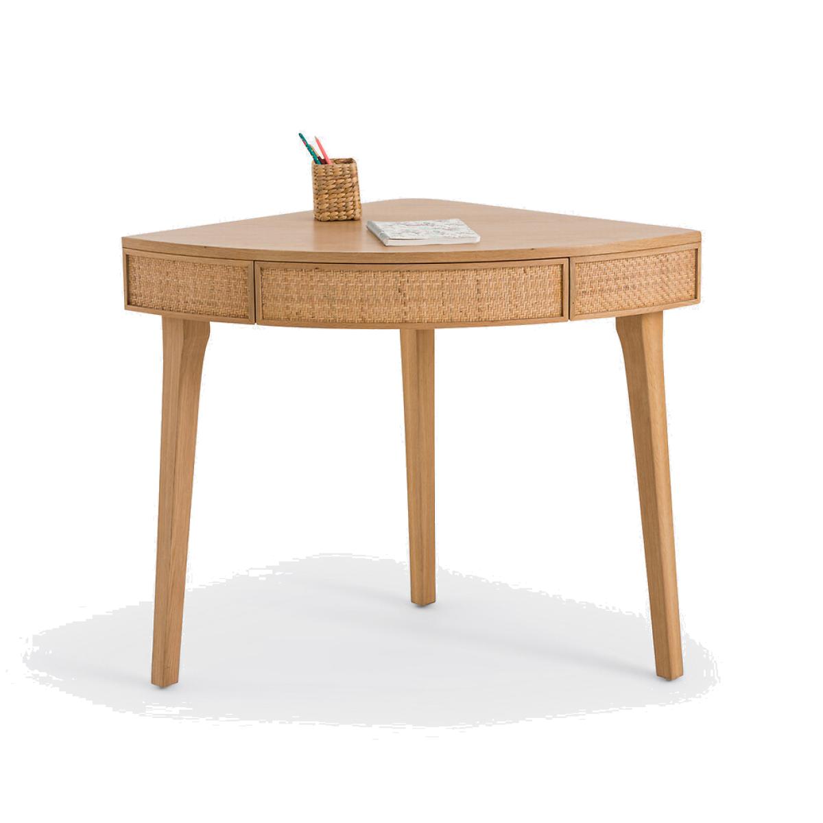 The Achilde agile desk is part of our Les Ingénieux collection. Creations full of ideas to make life simpler and everyday life more beautiful, imagined by our designers in France..Rattan fronts for a bohemian note and solid oak base: clever, Achilde allows you to create a work space in the lost corner of a room. Add your laptop, a small lamp and some accessories to complete the look. Why you'll love this product • For an office corner that rounds the corners • It slips into lost corners and saves space. Perfect for small spaces • A single piece of furniture with two functions: desk for teleworking or console to display books, decorative objects... the choice is yours • Its drawer, practical for storing small office equipment • Made from FSC® certified wood. Product Details • 1 drawer and space for cable management • FSC® oak and oak-veneered eucalyptus plywood with a nitrocellulose varnish finish • Woven rattan facades • FSC® solid oak legs with a nitrocellulose varnish finishDimensions. Overall • Width: 99cm • Height: 77cm • Depth: 66.5cm • Weight: 15kg. Usable space • Drawer: L48.5 x H7 x D34.5cm • Height of legs: 63cmDelivery:. Assembly required. Available for home delivery. Note! Please check that all access points are large enough to accommodate your delivery (doors, stairs, lifts). • WOOD FROM SUSTAINABLY MANAGED FORESTS. FSC® certified wood comes from forests that are environmentally, socially and economically well managed. Dimensions and weight of parcel1 parcel • L84 x H17.5 x D76cm. 17.2kg