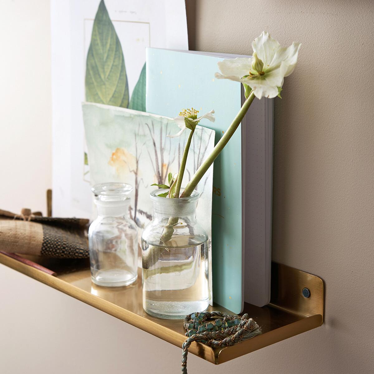 Display your favourite items on this smart shelf with a shallow edge to prevent precious items from falling. Convenient and on-trend, it will find its place in every room of the house. Product Details • Metal with a brass or black finish • Wall fixing (screws and plugs not supplied) • 2 colours available. Dimensions • L43 x D12 x H4cm