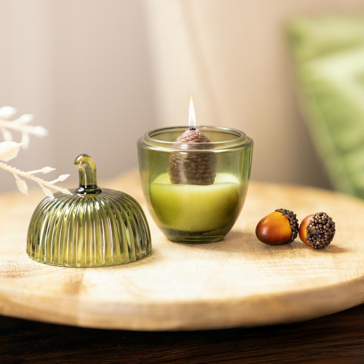 I love the acorn glass candle holder because its vibrant green hue makes it a versatile piece that can add colour and character to both modern and more traditional interiors. It works particularly well in cosy living rooms, bedrooms, or even outdoor settings where its nature-inspired tone complements botanical or rustic themes. For styling, try pairing it with neutral or earthy tones for a balanced look, and consider using it as a centrepiece on a mantel or side table. Its transparency and colour lend themselves to layered candle arrangements or simply on their own to create a calming, ambient glow. Practical tip: group multiple holders of different sizes for added visual interest or place it with natural materials like wood and linen for a relaxed, cohesive vibe.
