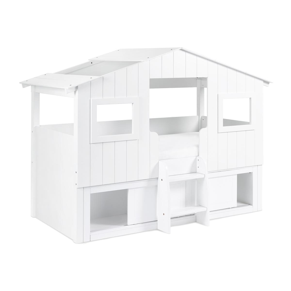 Step into a whimsical woodland wonderland with the Acorn Treehouse Midsleeper Storage Unit, transforming your child's bedroom into an enchanting escape. This magical treehouse-style bed boasts a charming white panelled front and rooftop adorned with two square windows, sparking imaginative adventures. Watch as your little explorer climbs into their cosy retreat using the two small step ladder and gets lost in endless daydreams while peering out of the roof gap. Below awaits a slide-door storage unit, the perfect hideaway for stowing books and toys - ensuring a tidy and organised space.