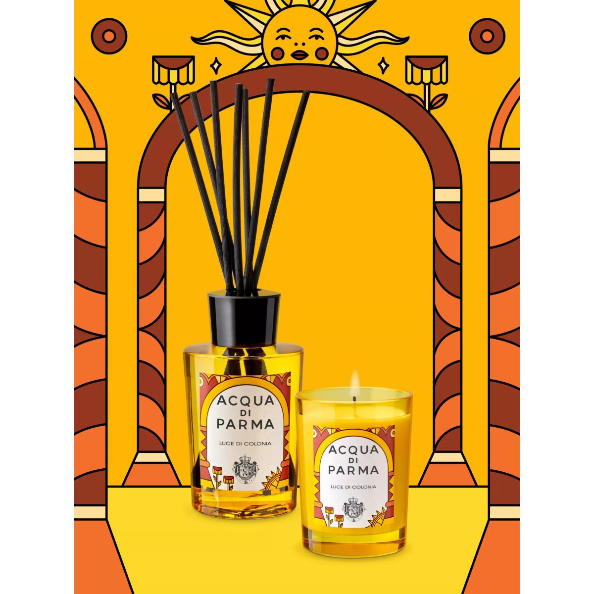 The classic Acqua di Parma yellow glass is adorned by an animated label showing the dynamic icons of Italy and is inspired by the scent's quintessential essence; sunflowers, arches, and the Italian sun. Elegantly timeless, Luce di Colonia radiates brightness through your space with its harmonious blend of citrus essences, floral notes, and woody accents. Invite the Italian sunshine into your home and inspire memories of unforgettable moments. Olfactive family: Citrus. Tasting Notes: Orange, lemon, petitgrain, neroli, patchouli, vetiver.