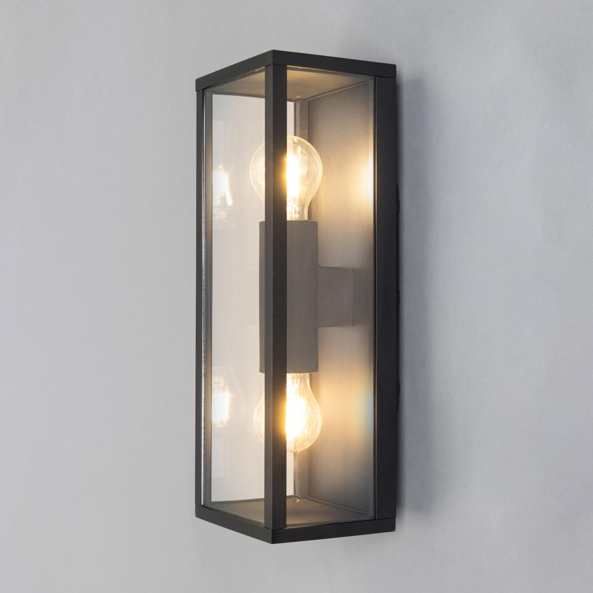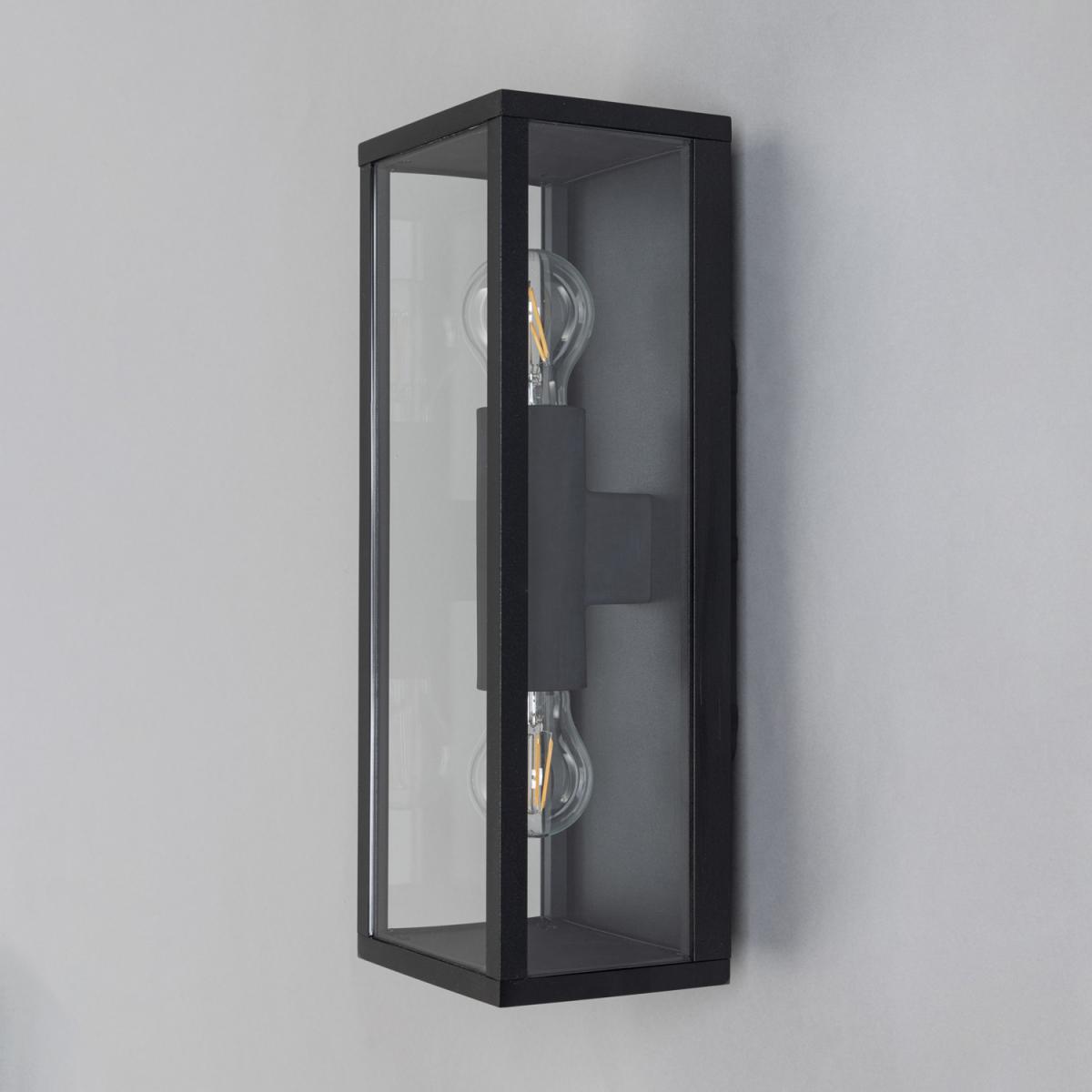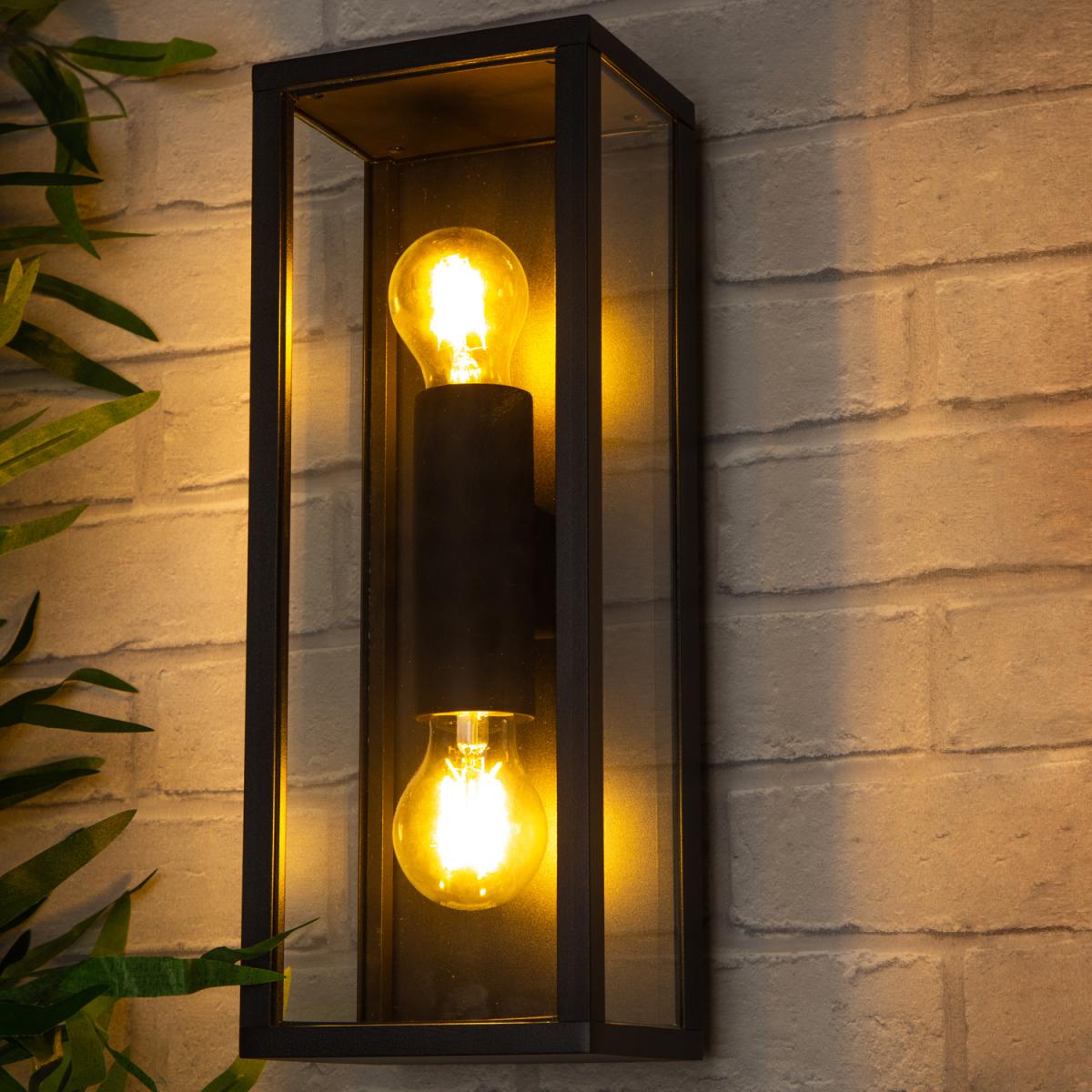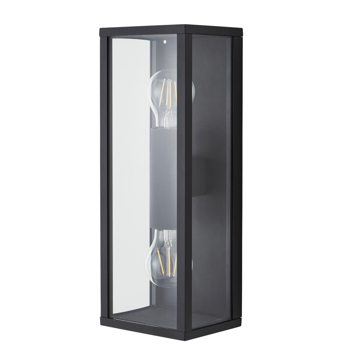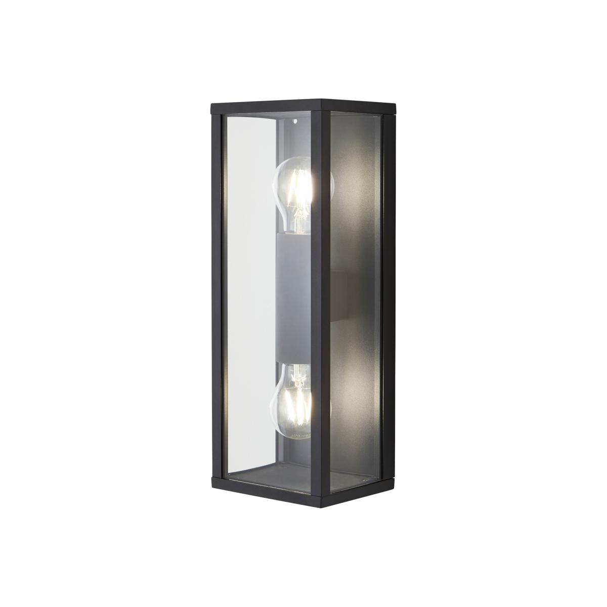 The Acrea 2 Light Glass Panel Outdoor Wall Light in Black is a contemporary accent to adorn your entranceway. The black finish of this wall lantern adds a contemporary accent to the front of the home perfect for either a red brick or a rendered look.