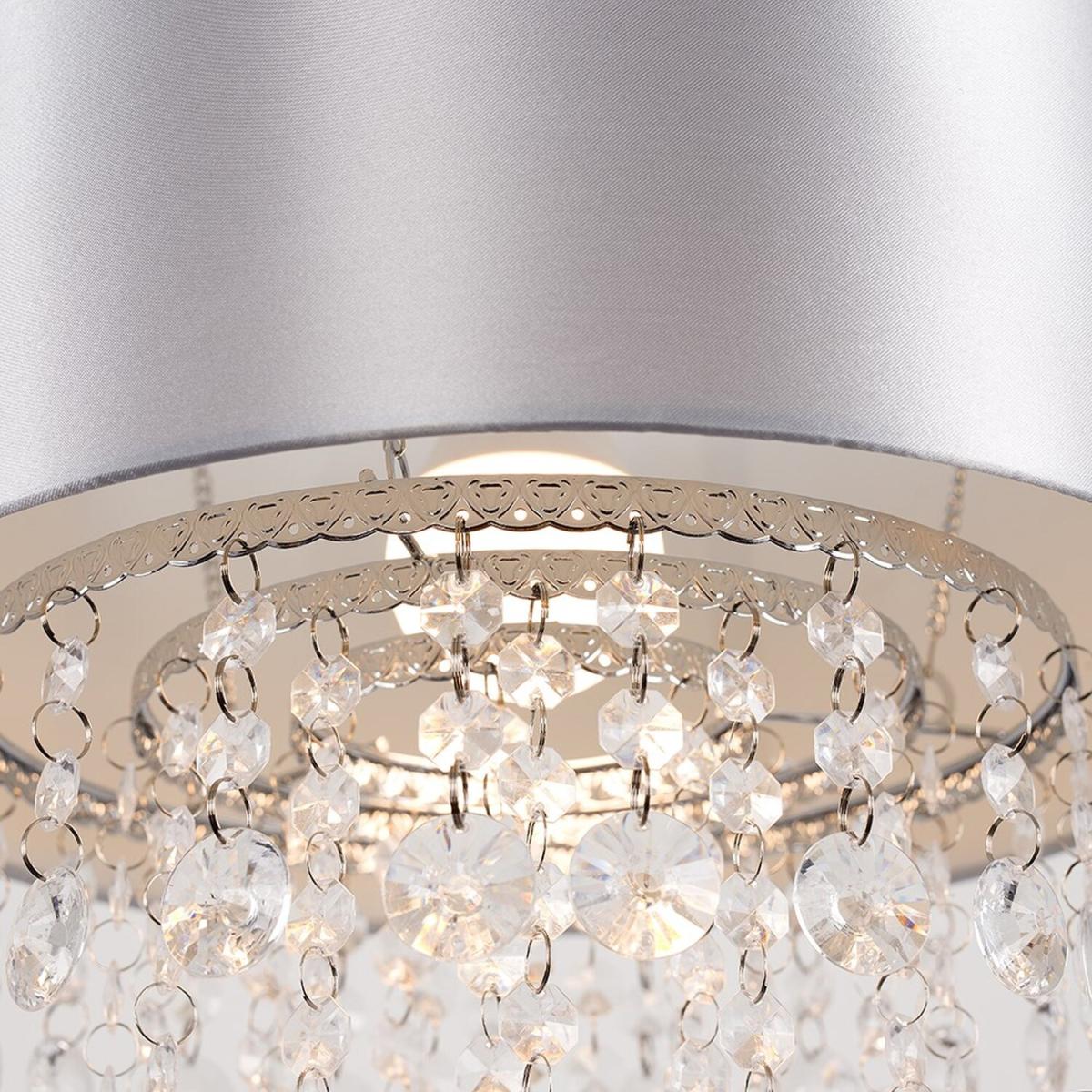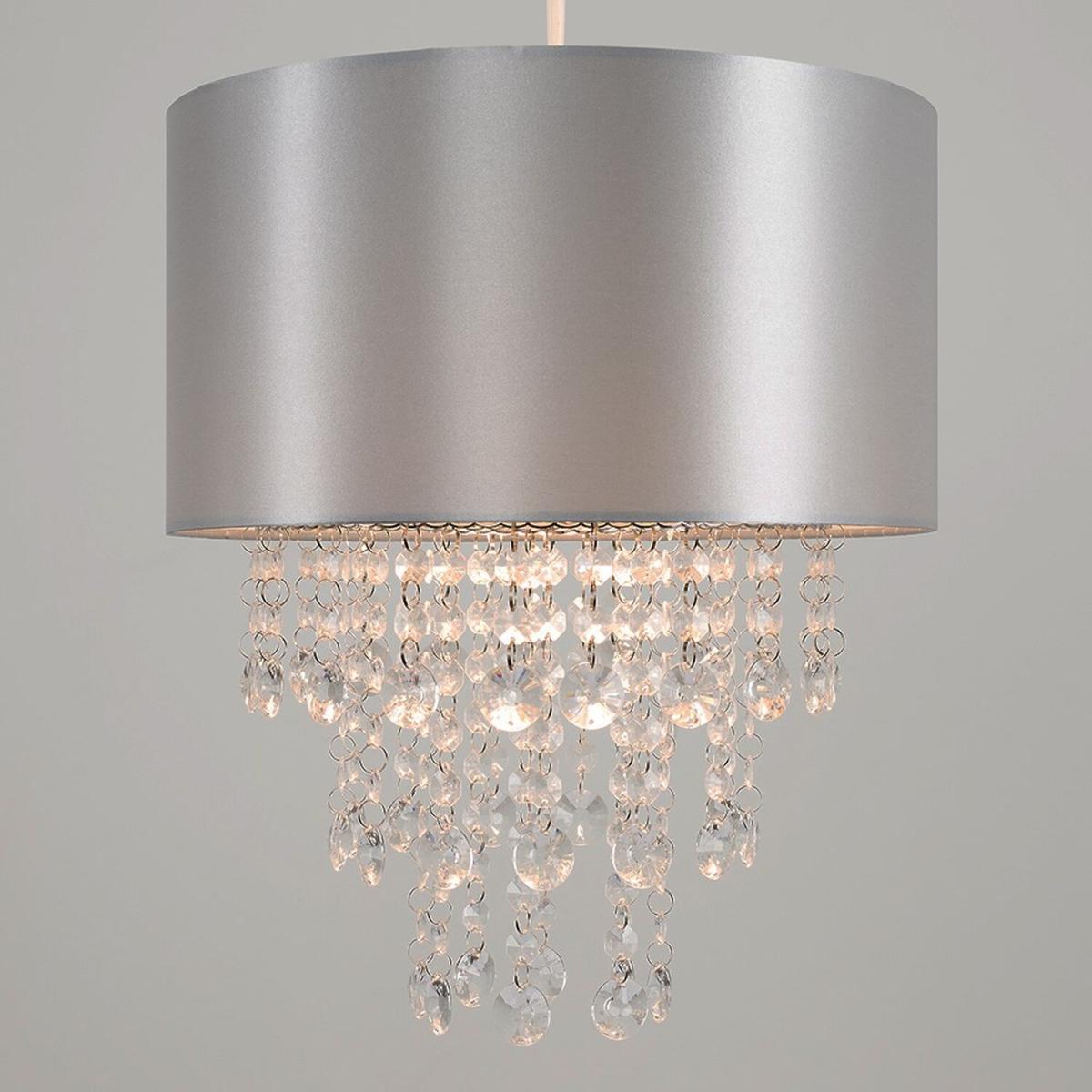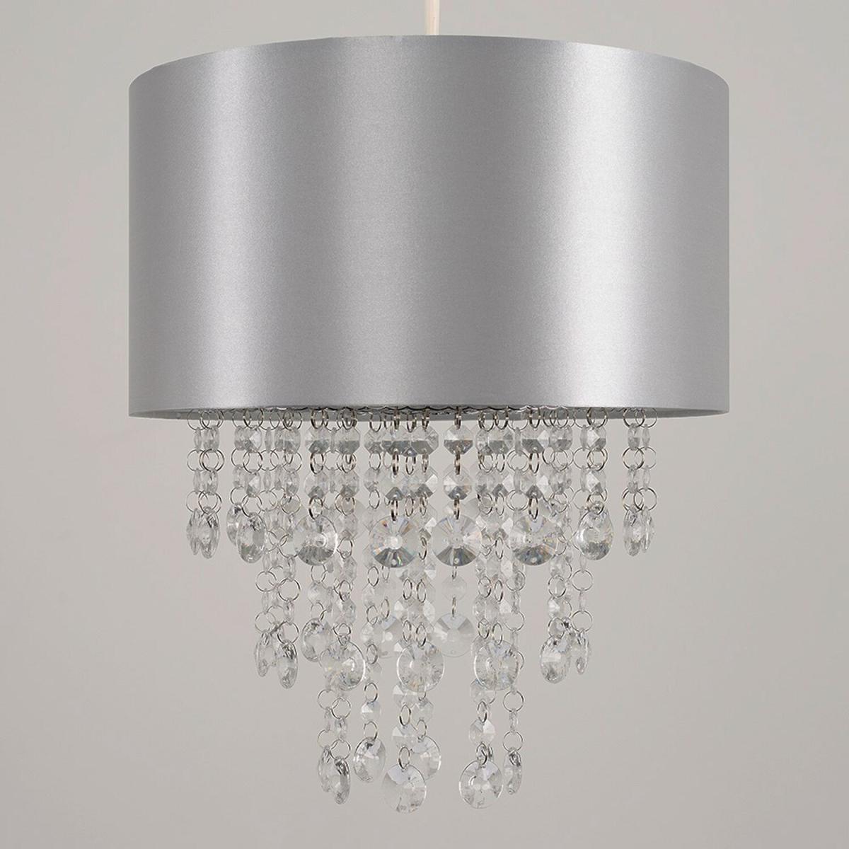 Modern cylinder ceiling pendant light shade in a grey fabric finish. Features cascading, light-reflecting clear acrylic jewel effect droplets, which cast the light beautifully around the room. Easily fits to your standard ceiling light socket - no wiring required. With a variety of colours available, this elegant lampshade goes perfectly with almost any style of interior design. Ideal for lounges, dining rooms, bedrooms and hallways.