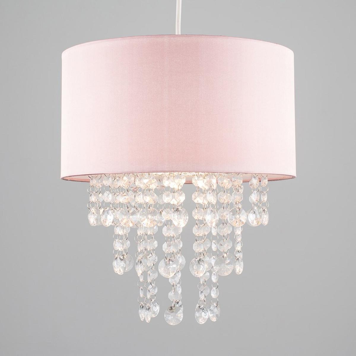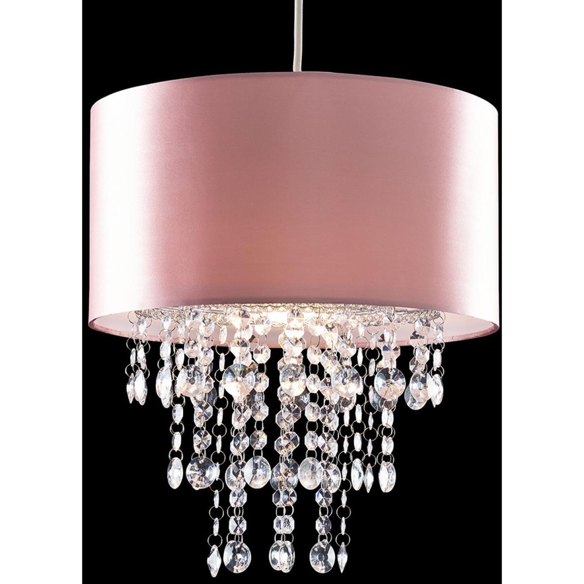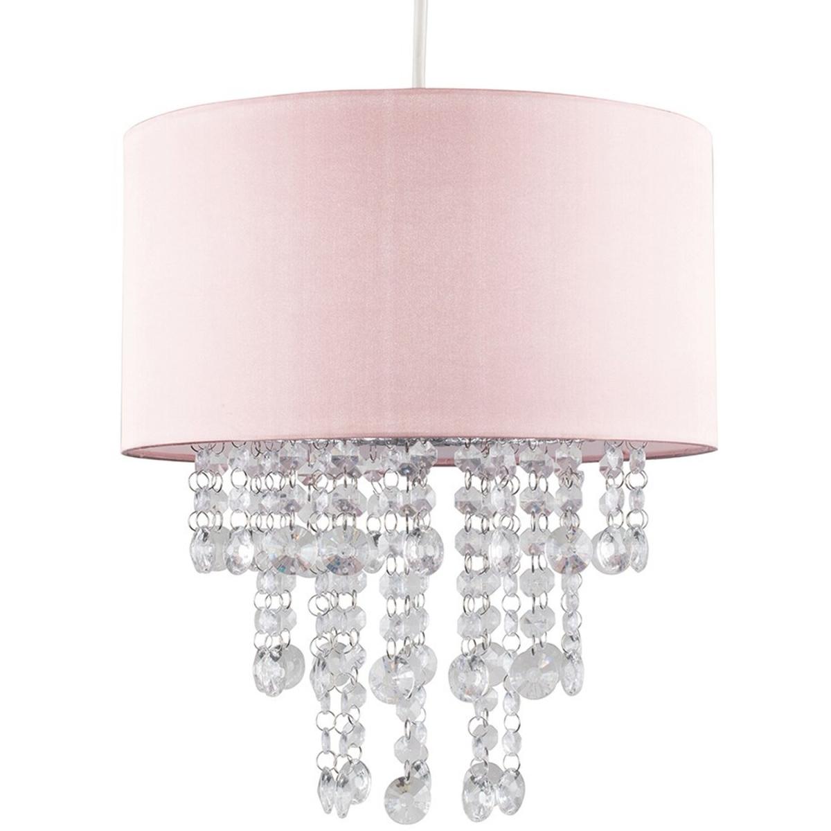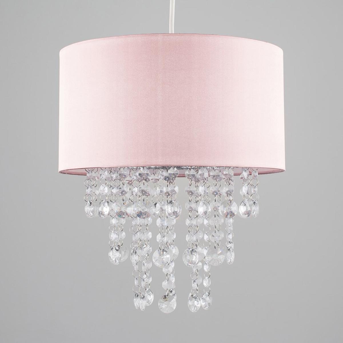 Modern cylinder ceiling pendant light shade in a pink fabric finish. Features cascading, light-reflecting clear acrylic jewel effect droplets, which cast the light beautifully around the room. Easily fits to your standard ceiling light socket - no wiring required. With a variety of colours available, this elegant lampshade goes perfectly with almost any style of interior design. Ideal for lounges, dining rooms, bedrooms and hallways.