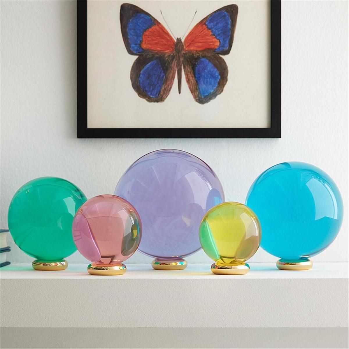 I really like these glass orbs because they offer a modern, colour-pop touch in any interior. They work particularly well in minimalist or contemporary settings where they can serve as statement pieces or accent decor. To style them effectively, consider grouping a few on a neutral tray or low table, or even arranging them in a clear bowl to create visual interest without clutter. Their transparent and coloured qualities make them versatile, catching light beautifully and adding a playful yet sophisticated vibe. Just ensure they’re placed somewhere visible but protected from knocks, so they can be appreciated as functional art.