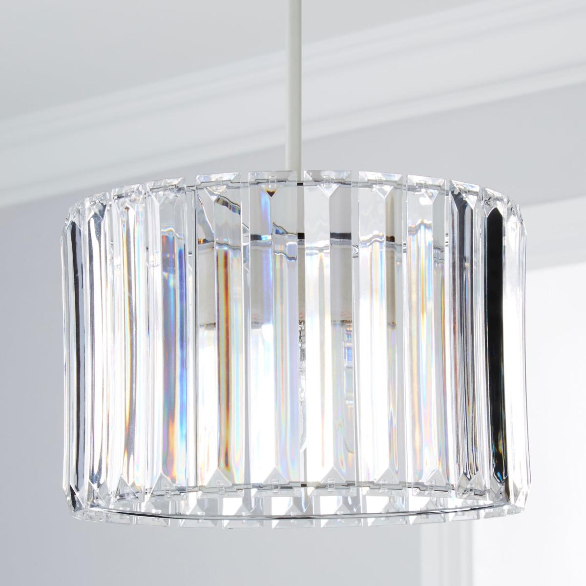 Detailed with vertical strips of sparkling acrylic prisms, this circular silver ceiling pendant will add a glamorous feel to any interior space. Easy Fit pendants are ideal for a quick style change without needing an electrician. Simply assemble on to your existing ceiling fitting, and you’re good to go within minutes! Don’t forget to choose the correct bulb for your ceiling fitting. Please note that this product requires one bulb. 60 Watt BC (B22) GLS is recommended. Bulbs are not included with this product.