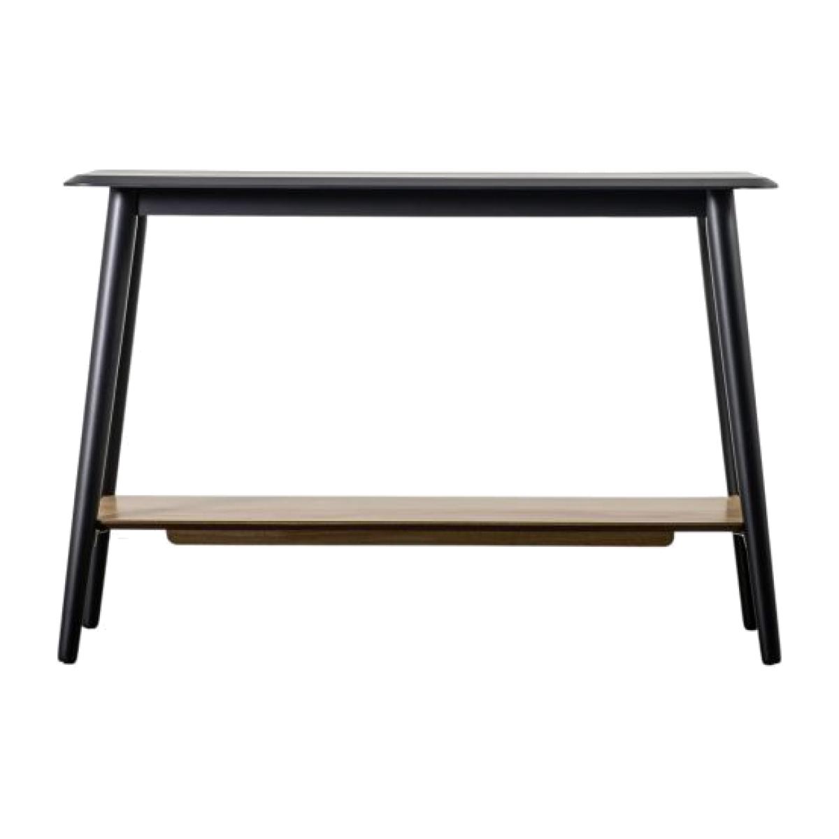 Offering a modern twist on mid-century style, this lovely console table features solid timber legs in a black finish paired with a black oak veneer top and a natural oak veneer shelf to add contrast for a more contemporary look. It is part of a collection offering a range of elegant living and dining tables. They are designed for easy delivery to any room in any property, whilst reducing the packaging needed. Easy assembly is required, but all the tools needed are supplied. Material: Rubber Wood. Colour/Finish: Black. Table Shape: Rectangle.