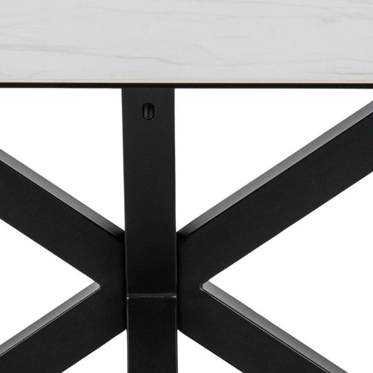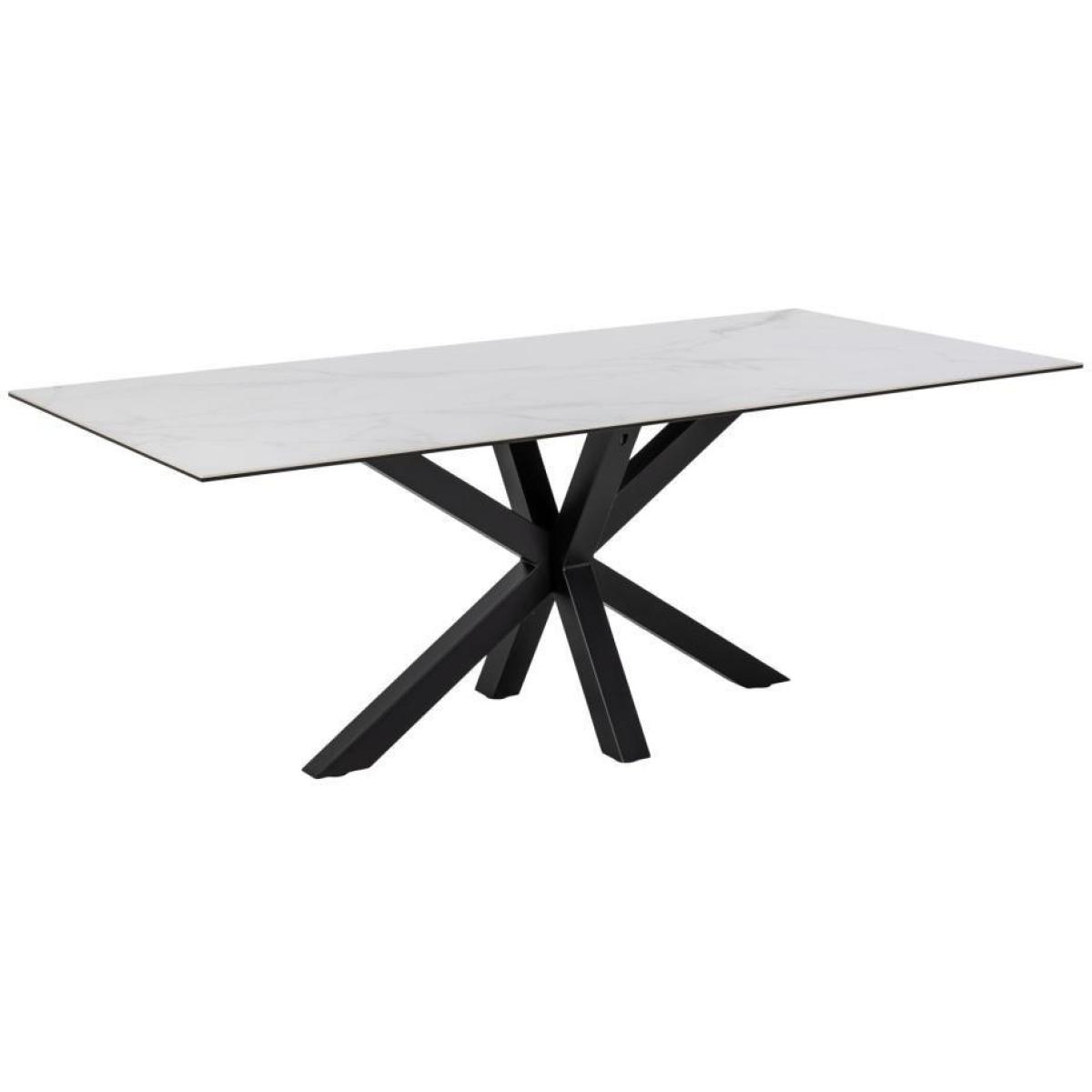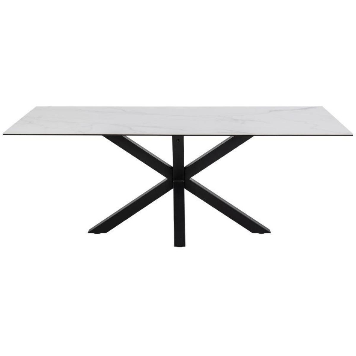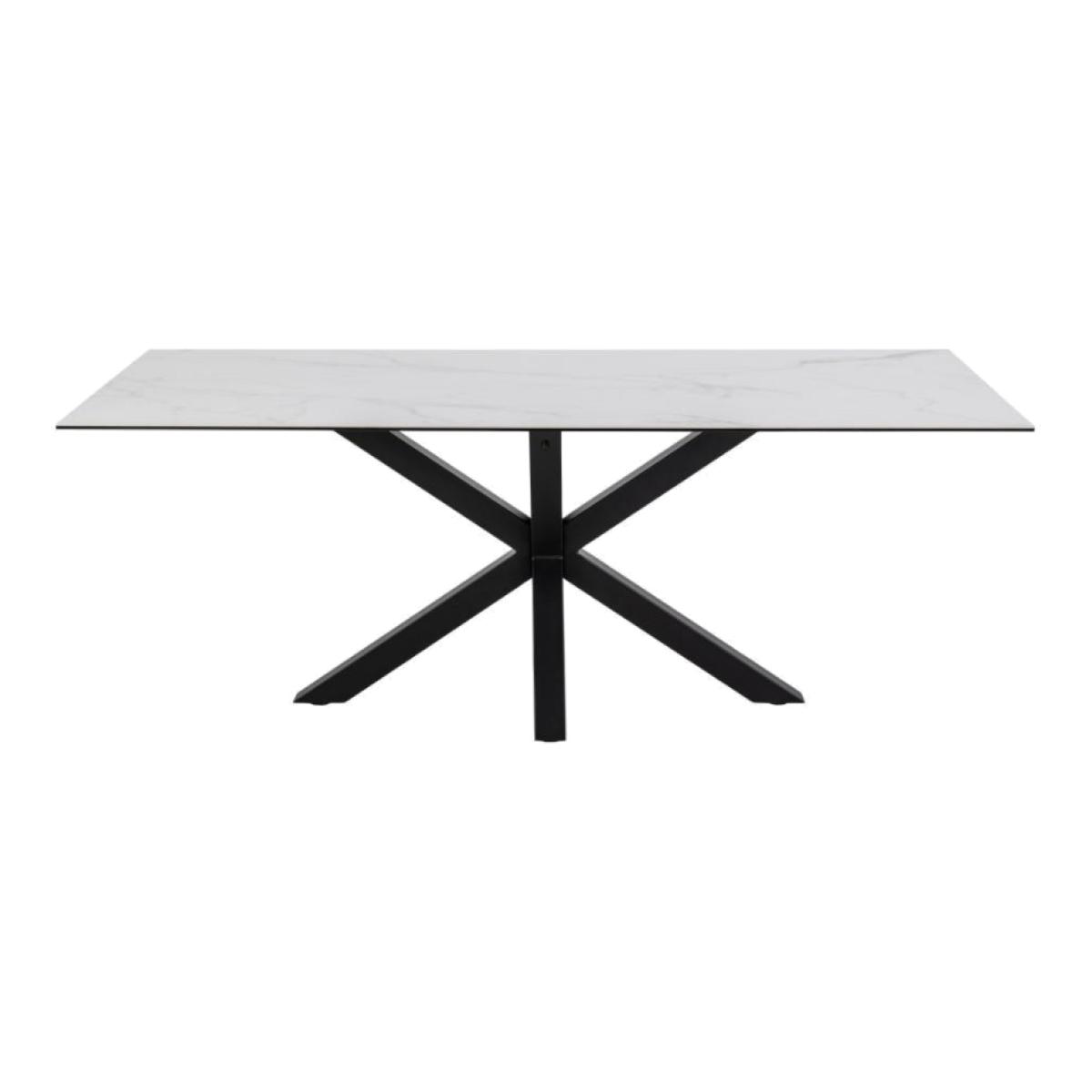 The white dining table offers balanced aesthetics as well as generous space for up to 8 people. Designed with a heat and scratch resistant ceramic tabletop and a sculptural metal cross base in black colour, this table with a marble look has a modern expression and is easy to maintain as well. Such characteristics make the design an ideal addition to any home. Width: 200 cm Depth: 100 cm Height: 75.5 cm
