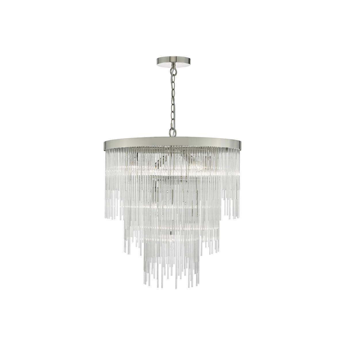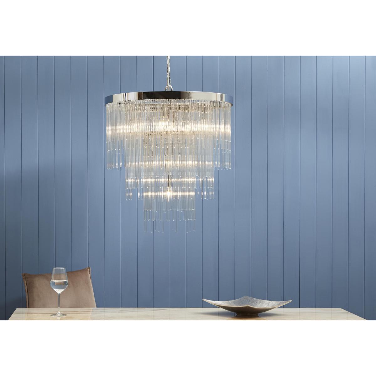 If you’re looking for a truly spectacular, modern chandelier style pendant ceiling light, the Ada 7 light pendant fits the bill perfectly. This pendant light has 380 clear glass rods cascading from three circular polished chrome tiers, creating a multi-layered, lavish waterfall effect. The seven lights shine through each tier, so that the glass rods sparkle and shimmer, reflecting the light. This large and impressive glass pendant light is supplied with 2 metres of chain, fully adjustable on installation. This light fitting is heavy so requires careful fitting. The Ada 7 light pendant fits seven 40W (E14) candle bulbs. Dimensions. Width diameter: 60cm (24in). Height: 80cm – 270cm (31in – 106in).