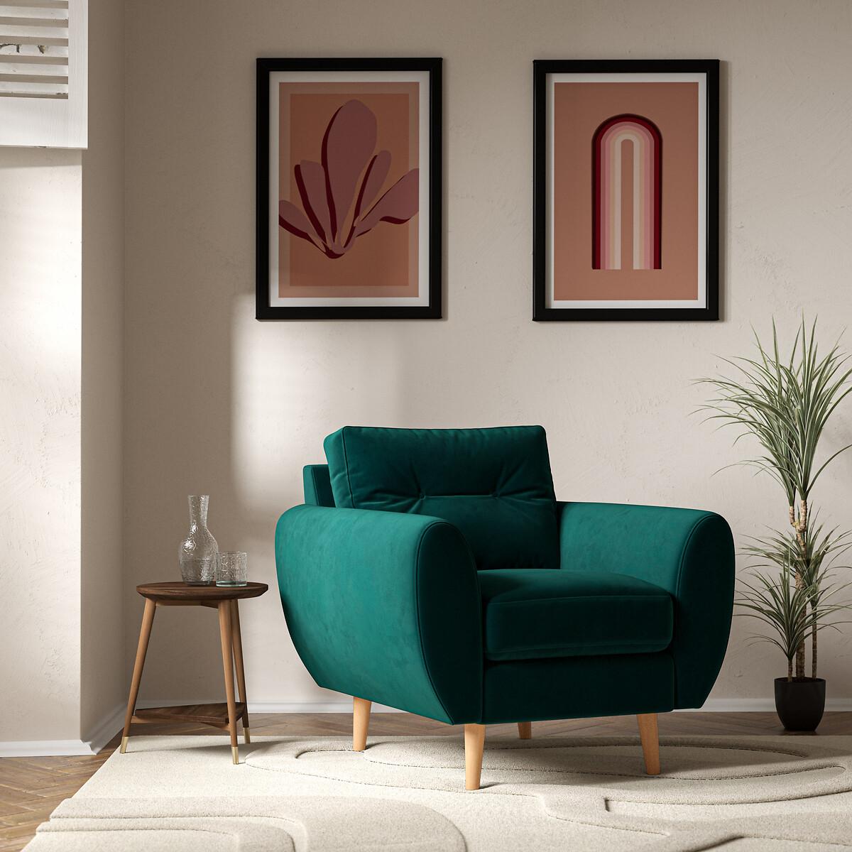Mid-century design meets maximum comfort. A classic buttoned back is paired with a beautiful elliptical arm shape, creating the perfect modern retro look. Plump side cushions add extra cosiness, whereas foam and fibre fillings ensure this sofa keeps its shape without compromising on comfort. Scandi-style splayed legs, are the ideal partner to Ada's clean curved design. Choose from our soft brushed fabric for ultimate cosiness, soft woven for a textured look or velvet for luxe living. The Ada is available in several sizes, including an armchair, snuggle chair, 2 seater, 3 seater and corner sofa. The Ada is also available with a plain back. Product details• Velvet - An elegant velvet with a dense and matte finish, perfect for those wanting a rich and luxurious look. A flat finish pile makes it difficult for the material to snag – ideal if you live with pets and sure to prove durable for years to come. Check it's right for you - order a FREE swatch above.• Created with medium density foam fillings for a sofa with a level of comfort suitable for most. • Foam filled seats provide great support without compromising on comfort, and require little maintenance to keep their shape, ensuring your sofa looks as good as it does the day you welcomed it into your living room.• Fibre backs provide extra softness and give you that "sink in" feeling.• Just flip to freshen up - both the seat cushions and back cushions are fully reversible so it's easy to keep your sofa looking its best.• Seat covers are removal (zip fastening). Back covers not removable due to button finishes. • FSC® solid beech hardwood frame - made of wood from responsibly managed forests that provide environmental, social and economic benefits.• Tapered feet crafted entirely from solid wood ensure durability and stability.• Removable feet.• Lovingly handmade in the UK.All our made to order sofas are carefully manufactured in the UK.Each hardwood frame is dowelled, glued, and screwed before being paired with the finest fabrics and fillings. And it doesn't stop there - for customer peace of mind and safety, all frames and fabrics are rigorously examined, inspected, and tested to the highest standards. All filling material(s) and covering fabric(s) meet the requirements for resistance to cigarette and match ignition in the 1988 safety regulations. This sofa comes with a 3 year manufacturer warranty from date of delivery (subject to terms and conditions)Product composition• Fabric - Velvet (100% polyester)• Seat Fillings - Foam and fibre• Back Fillings - Fibre• Frame - Beech Hardwood (FSC), OSB (UK origin, FSC)• Feet - Solid Wood. Product Dimensions Overall width: 88 cm. Overall depth: 90 cm. Overall height: 88 cm. Seat height: 48 cm. Seat depth: 53 cm. Seat width between the arms: 53 cm. Back height (from base): 70 cm. Back height (from seat): 45 cm. Arm height (from floor): 66 cm. Arm height (from seat): 21 cm Clearance to floor (leg height): 18 cm. Please remember to measure your available space before ordering to be sure your sofa will fit. Don't forget to measure accessways and corners, and consider any obstacles. Package DimensionsL9. 1 cm x W89 cm x H92 cm, Weight 37.5 kg. This product will be dispatched by one of our trusted suppliers. You’ll be contacted by their selected courier about your delivery. Your product will be delivered to your room of choice. Feet may be assembled on arrival. BELFI01