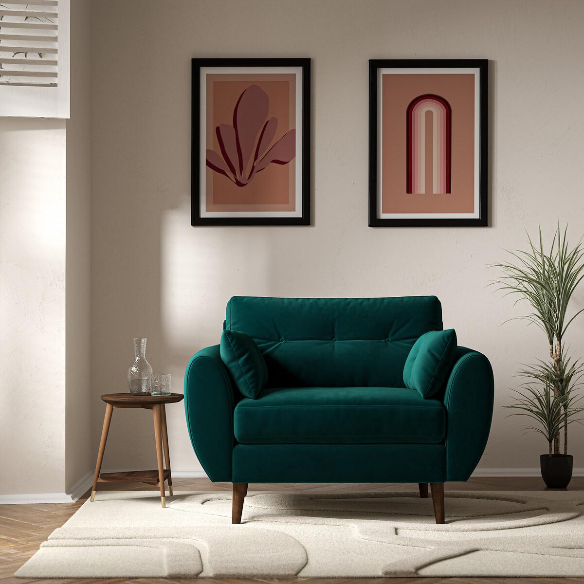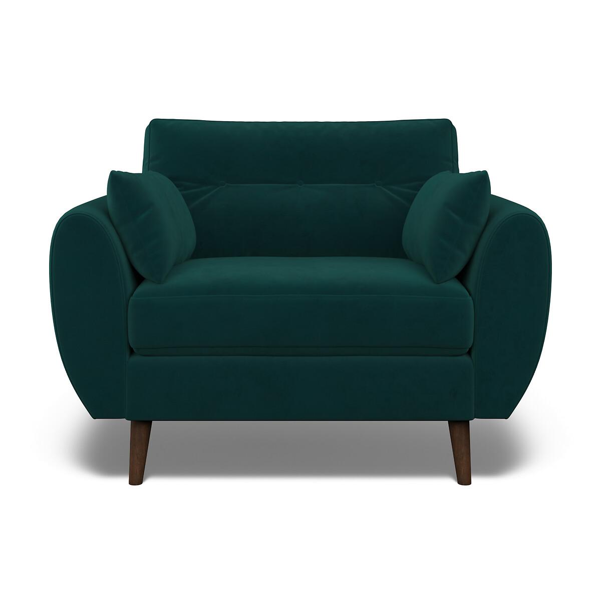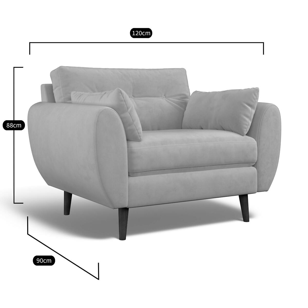 Meet the Ada snuggle chair - deliciously spacious for one, or perfect for cuddles. Mid-century design meets maximum comfort. A classic buttoned back is paired with a beautiful elliptical arm shape, creating the perfect modern retro look. Plump side cushions add extra cosiness, whereas foam and fibre fillings ensure this sofa keeps its shape without compromising on comfort. Scandi-style splayed legs, are the ideal partner to Ada's clean curved design. Choose from our soft brushed fabric for ultimate cosiness, soft woven for a textured look or velvet for luxe living. The Ada is available in several sizes, including an armchair, snuggle chair, 2 seater, 3 seater and corner sofa. The Ada is also available with a plain back. Product details• Velvet - An elegant velvet with a dense and matte finish, perfect for those wanting a rich and luxurious look. A flat finish pile makes it difficult for the material to snag – ideal if you live with pets and sure to prove durable for years to come. Check it's right for you - order a FREE swatch above.• Created with medium density foam fillings for a sofa with a level of comfort suitable for most. • Foam filled seats provide great support without compromising on comfort, and require little maintenance to keep their shape, ensuring your sofa looks as good as it does the day you welcomed it into your living room.• Fibre backs provide extra softness and give you that "sink in" feeling.• Two rectangular scatter cushions included for extra arm comfort.• Just flip to freshen up - both the seat cushions and back cushions are fully reversible so it's easy to keep your sofa looking its best.• Seat covers are removal (zip fastening). Back covers not removable due to button finishes. • FSC® solid beech hardwood frame - made of wood from responsibly managed forests that provide environmental, social and economic benefits.• Tapered feet crafted entirely from solid wood ensure durability and stability.• Removable feet.• Lovingly handmade in the UK.All our made to order sofas are carefully manufactured in the UK.Each hardwood frame is dowelled, glued, and screwed before being paired with the finest fabrics and fillings. And it doesn't stop there - for customer peace of mind and safety, all frames and fabrics are rigorously examined, inspected, and tested to the highest standards. All filling material(s) and covering fabric(s) meet the requirements for resistance to cigarette and match ignition in the 1988 safety regulations. This sofa comes with a 3 year manufacturer warranty from date of delivery (subject to terms and conditions)Product composition• Fabric - Velvet (100% polyester)• Seat Fillings - Foam and fibre• Back Fillings - Fibre• Frame - Beech Hardwood (FSC), OSB (UK origin, FSC)• Feet - Solid Wood. Product Dimensions Overall width: 120 cm. Overall depth: 90 cm. Overall height: 88 cm. Seat height: 48 cm. Seat depth: 53 cm. Seat width between the arms: 85 cm. Back height (from base): 70 cm. Back height (from seat): 45 cm. Arm height (from floor): 66 cm. Arm height (from seat): 21 cm Clearance to floor (leg height): 18 cm. Small scatter cushions x 2: L55 cm x W30 cm. Please remember to measure your available space before ordering to be sure your sofa will fit. Don't forget to measure accessways and corners, and consider any obstacles. Package DimensionsL12. 3 cm x W92 cm x H91 cm, Weight 37.5 kg. This product will be dispatched by one of our trusted suppliers. You’ll be contacted by their selected courier about your delivery. Your product will be delivered to your room of choice. Feet may be assembled on arrival. BELFI01