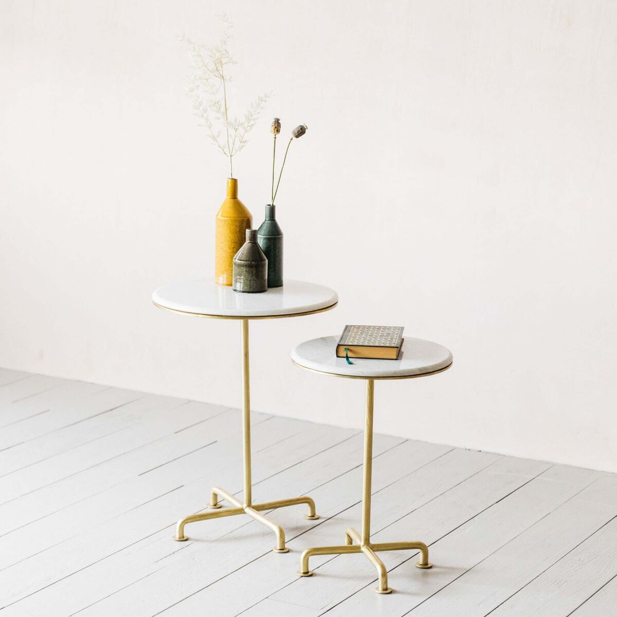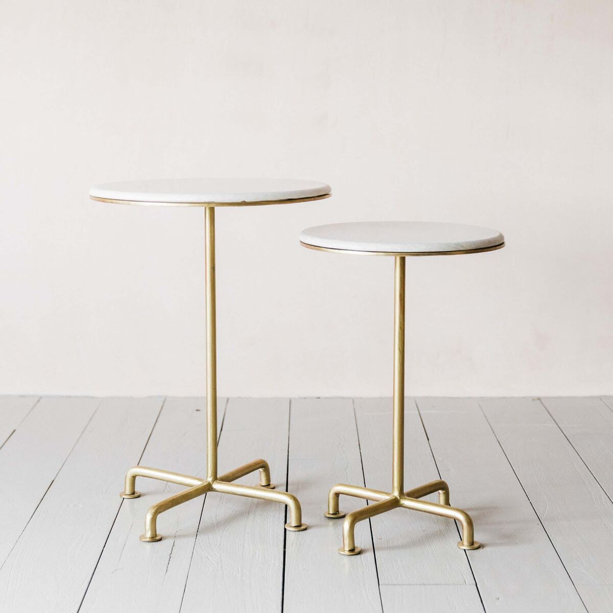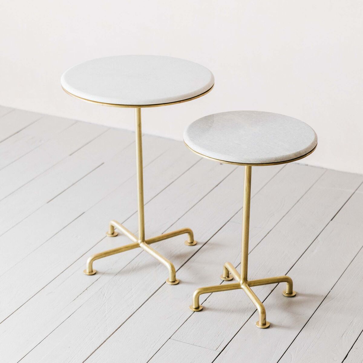 Featuring smooth, circular white marble tops and sleek iron stands with an opulent brass finish, our set of two Ada side tables will make an elegant and sophisticated addition to any living space.