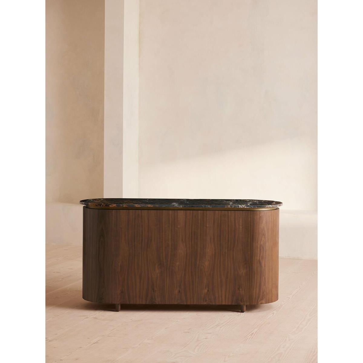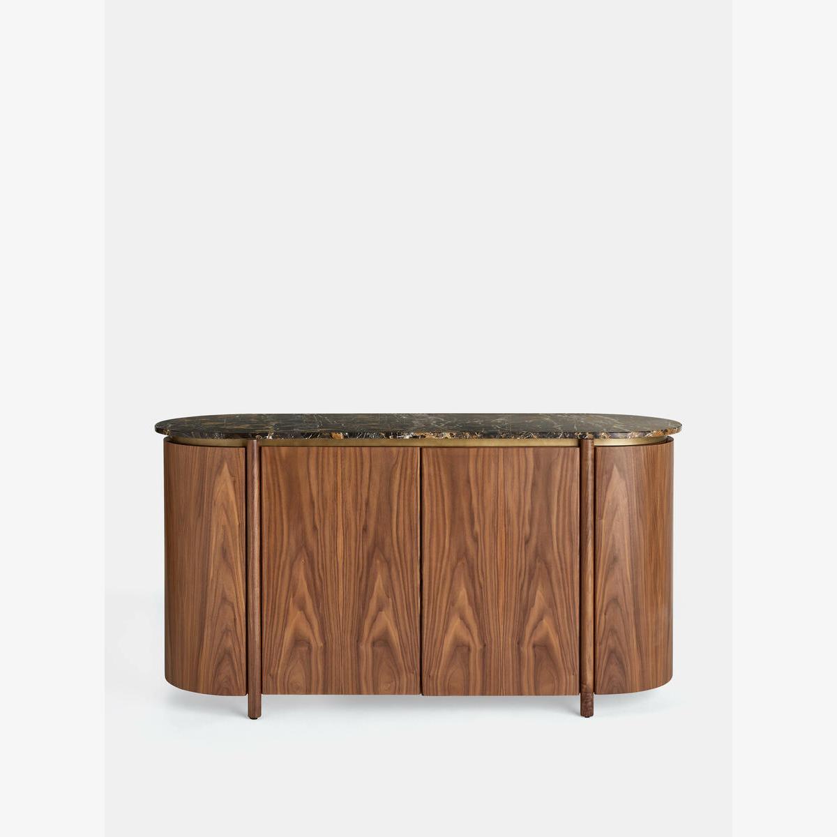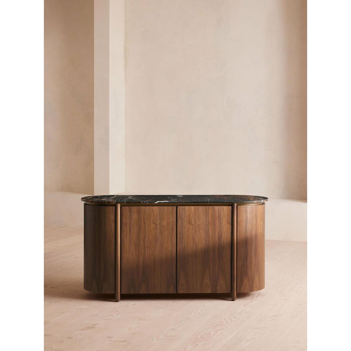 Our Ada sideboard contrasts dark walnut wood with a honed Michelangelo marble top. Sourced from Pakistan, this dramatic black and rust marble varies in characteristics, making no two designs the same. Antique brass finishes further elevate this piece, mirroring the interiors of Soho House Rome, while four soft-close doors and hidden recessed handles mean you can stow away your essentials in modern and functional style. Walnut wood sideboard Honed Michelangelo marble top Antique brass details Four soft-close doors Hidden recessed handles Inspired by Soho House Rome