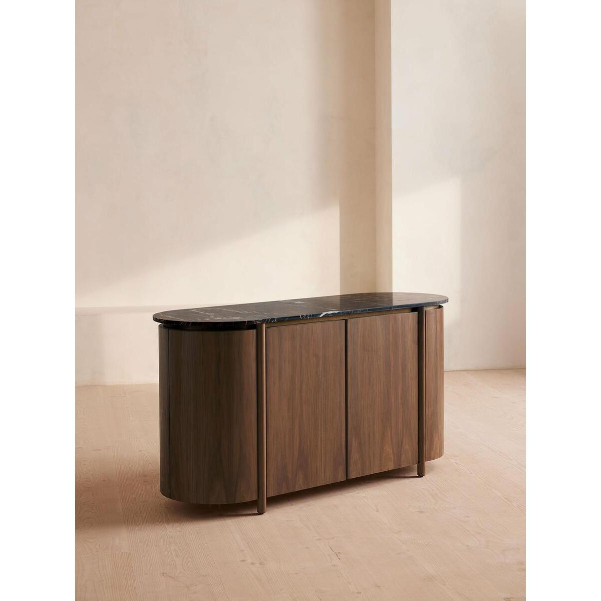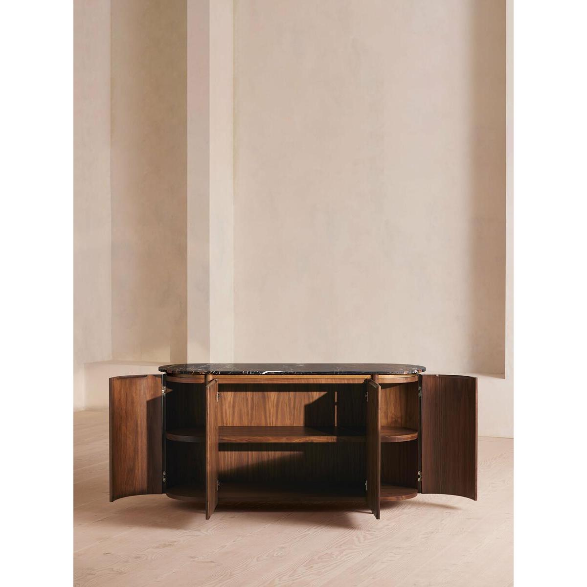I’m a fan of this sideboard for its clean lines and the way the dark marble top contrasts with the warm walnut veneer. It works equally well in a modern Scandi living room or a mid-century inspired dining space, adding both storage and a touch of natural texture. To style it, keep the surface uncluttered: try a low ceramic vase, a couple of coffee-table books and a sculptural lamp to balance height. Inside, use matching baskets or boxes to corral smaller items, and leave one shelf free for display pieces so it never feels too heavy.