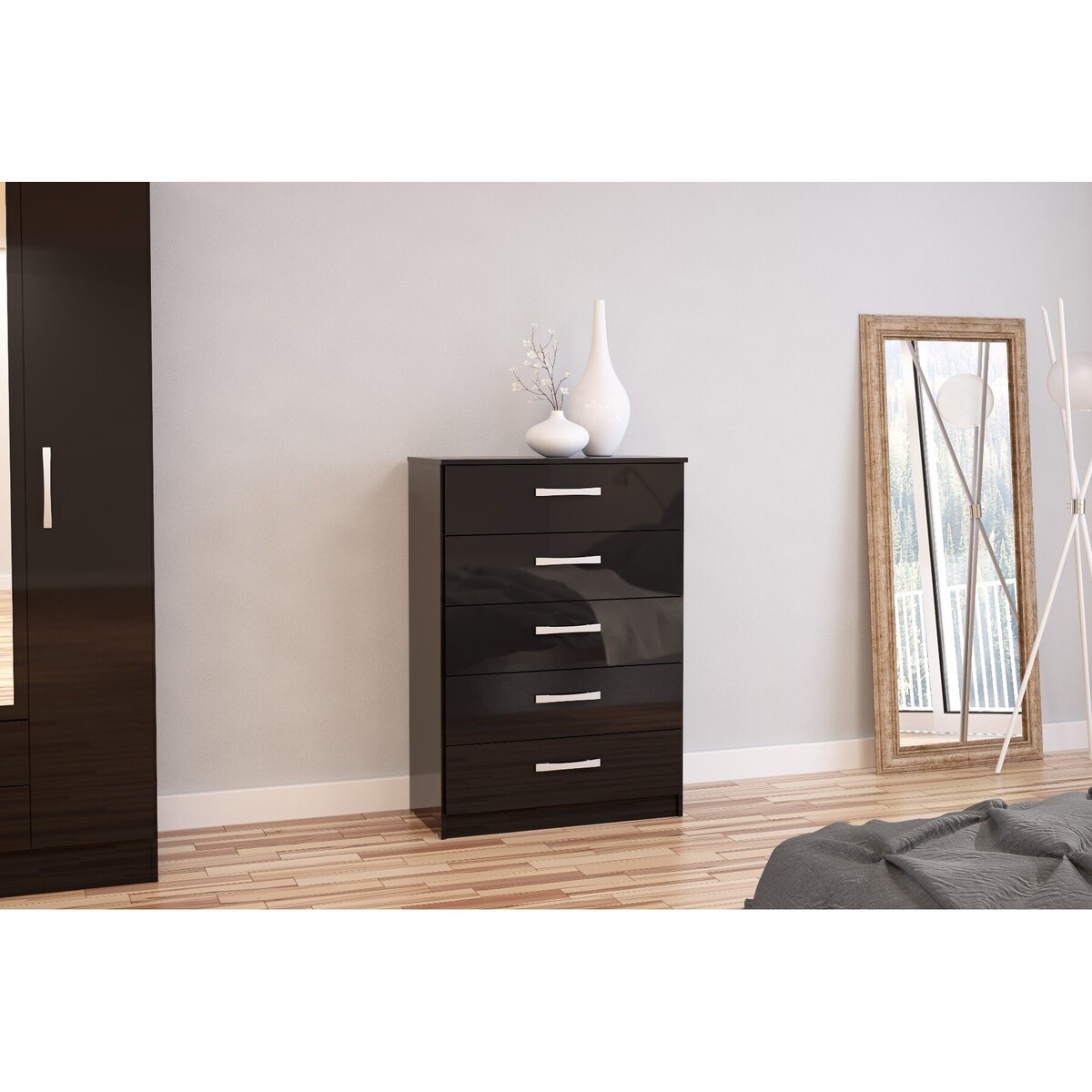 The sleek, ultra-modern Adalee collection, designed by Birlea, is perfect for homes with a contemporary feel. with both bedroom and occasional furniture available in multiple colours, there’s something for everyone. The Adalee five drawer chest in black is the perfect piece for a modern bedroom and the ideal storage solution. Pair with other items from the same range for a coordinated look. five generous drawers simple, clean design seamless high-gloss black finish easy to assemble