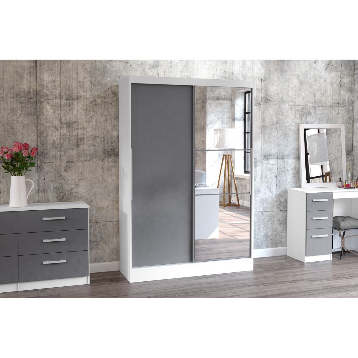 The white & grey Adalee 2 door sliding wardrobe is the ideal solution if you’re looking for both hanging and drawer space. Featuring an internal top shelf, a hanging rail which can hold up to 8kg of clothes and a mirrored door - it’s the ideal all in one storage item. Part of a larger collection by Birlea, the Adalee range is a sleek, stylish and ultra-modern range. Available in four high-gloss finish colour variations, this is the ultimate collection for modern and contemporary homes. matching items available from the Adalee range mirrored door the hanging rail can hold 8kg easy to assemble and care for