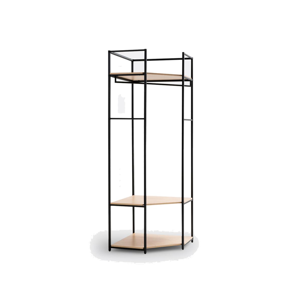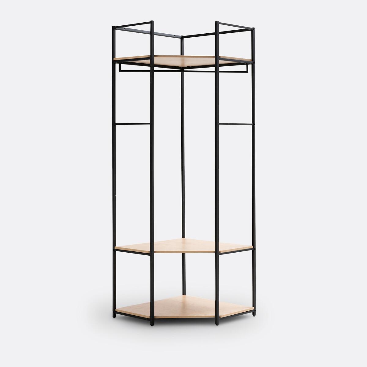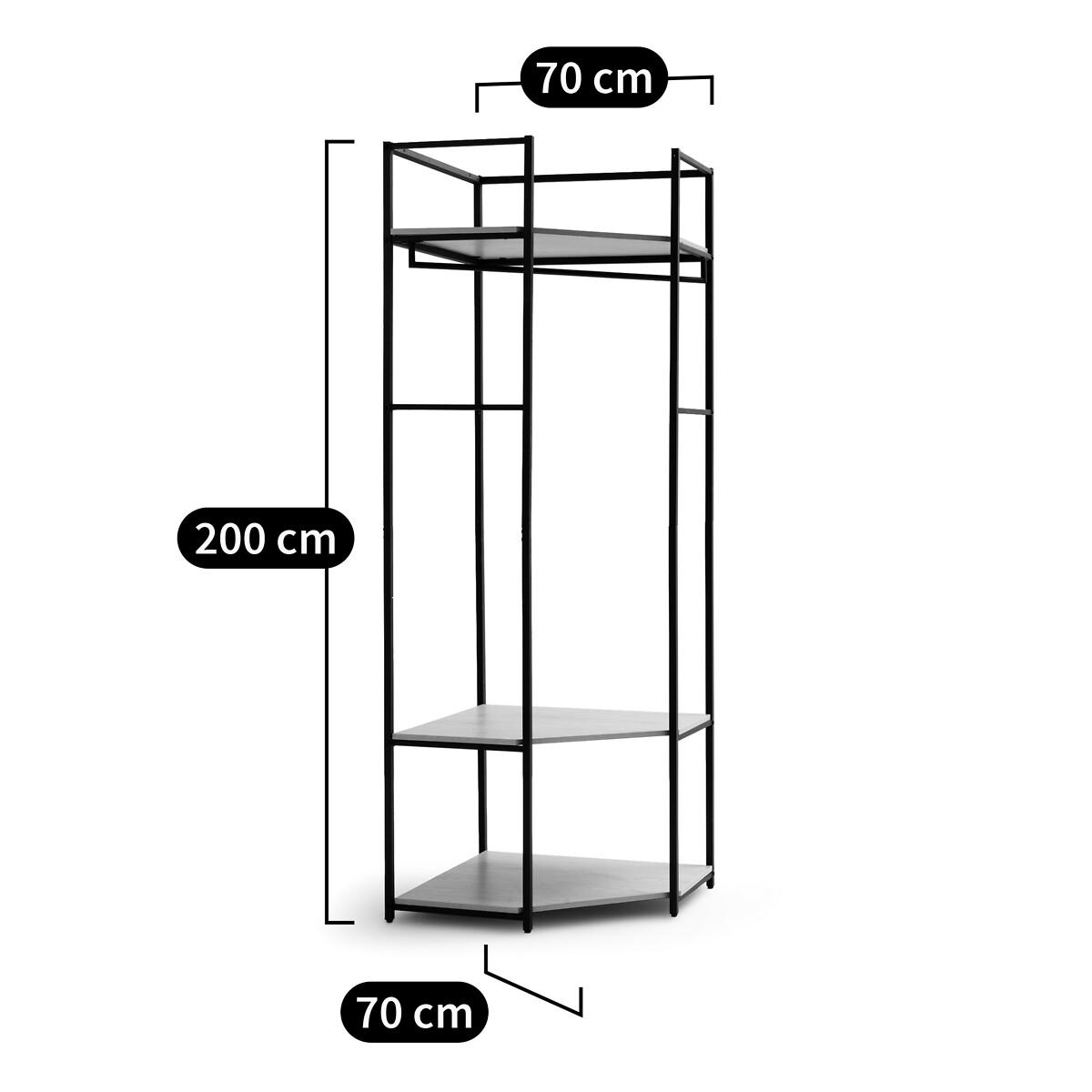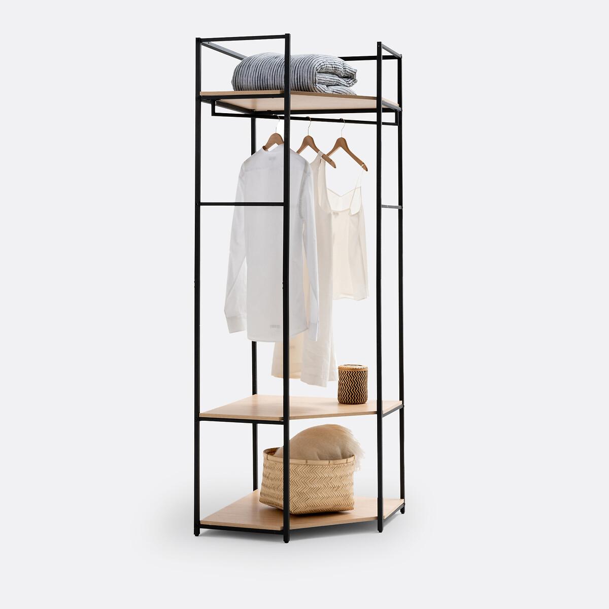This wardrobe/hanging rail in wood and metal has a sleek and contemporary design. Ideal for small spaces, Adarbi offers its storage in its height. This corner dressing room module offers 2 possible combinations with its wardrobe bar and its3 shelves. Each wardrobe module in the Adarbi range offers different possible assembly configurations, to allow you to design your own storage space. Product Details • Square structure and hanging rail in black metal with a grained matt effect epoxy finish • 3 MDF shelves with oak effect • Screws and wall plugs not supplied. Dimensions • Width: 70cm • Height: 200cm • Depth: 70cmDelivery:. Assembly required. Available for home delivery. Note! Please check that all access points are large enough to accommodate your delivery (doors, stairs, lifts). Dimensions and weight of parcel1 parcel • L74.5 x H19 x D110cm. 26kg.