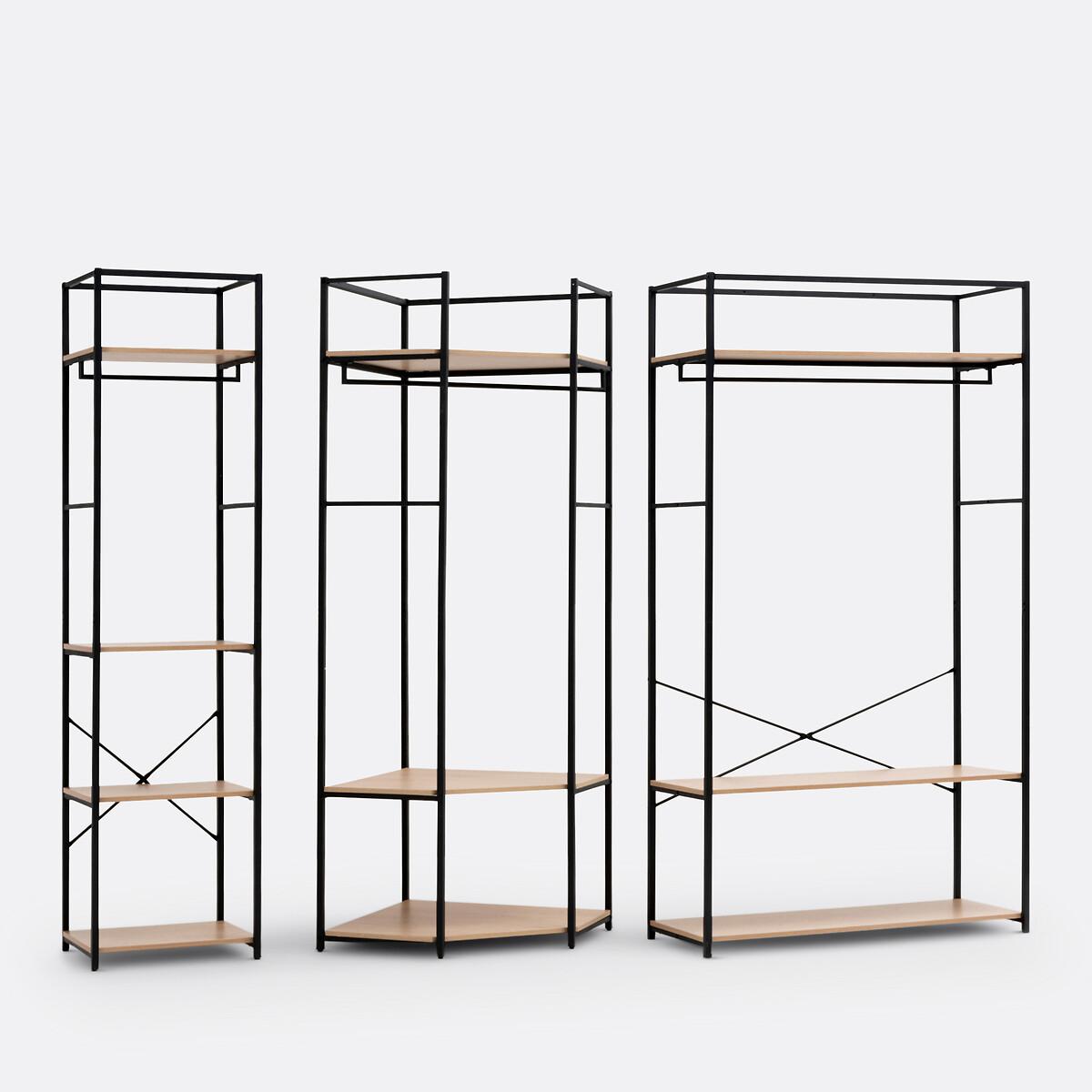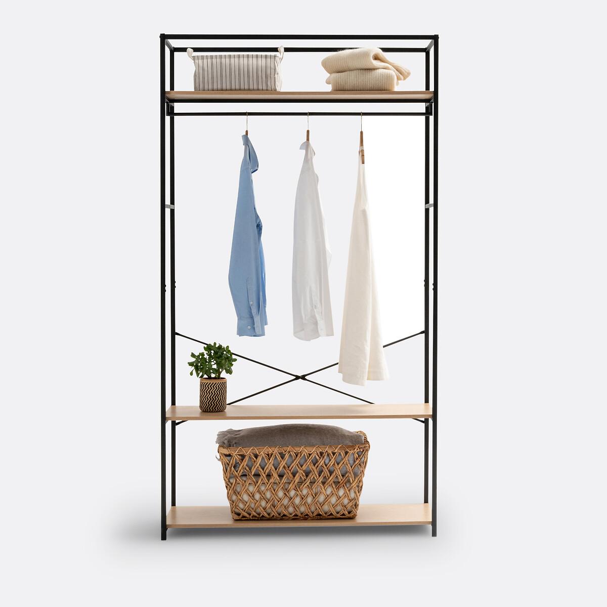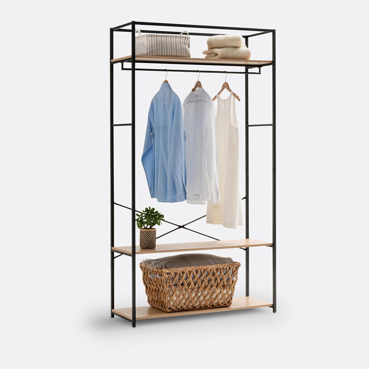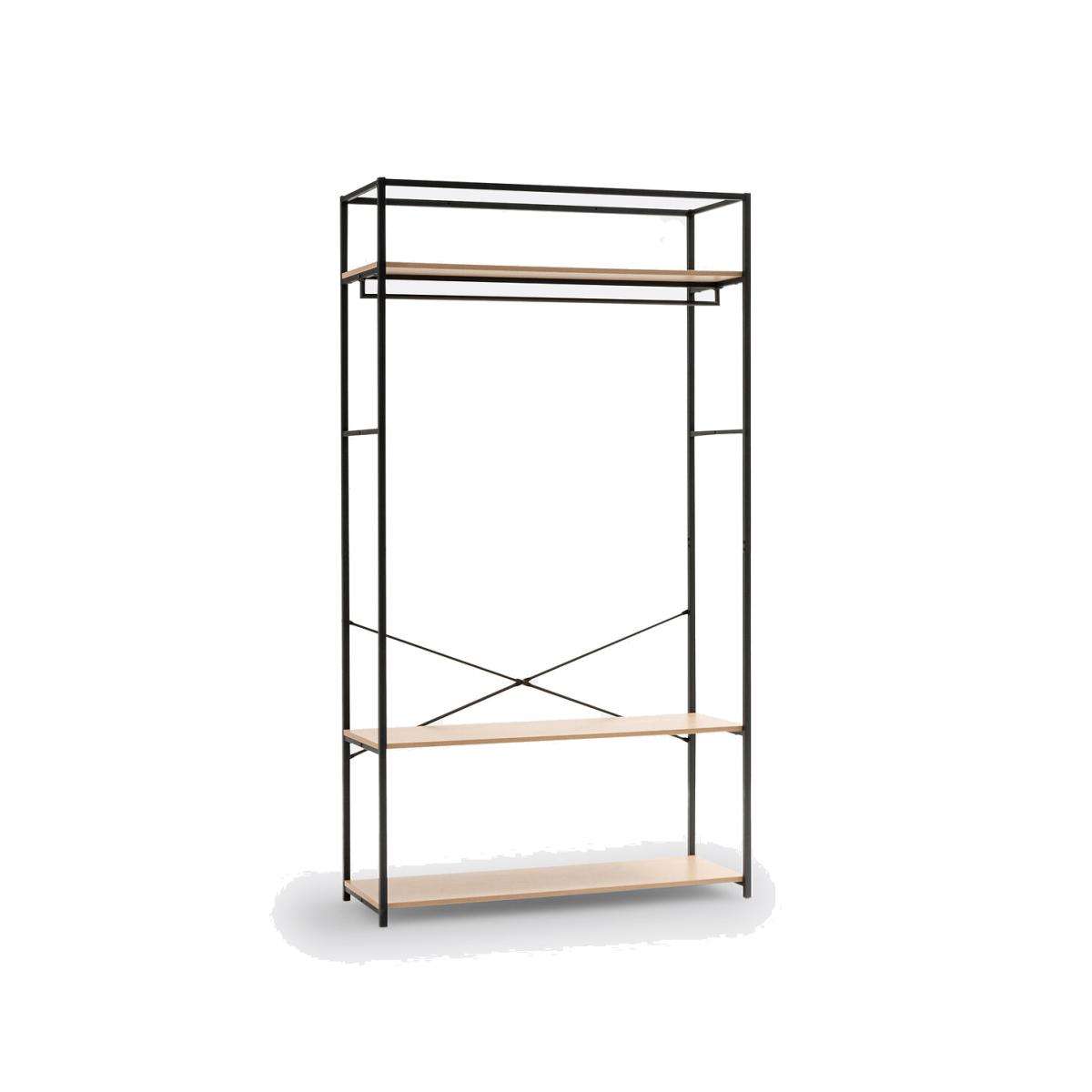 This wardrobe/hanging rail in wood and metal has a sleek and contemporary design. Ideal for small spaces, Adarbi offers its storage in its height. This dressing module offers 2 possible combinations with its hanging rail and 3 shelves. Each wardrobe module in the Adarbi range offers different possible assembly configurations, to allow you to design your own storage space. Product Details • Square structure and hanging rail in black metal with a grained matt effect epoxy finish • 3 MDF shelves with oak effect • Screws and wall plugs not supplied. Dimensions • Width: 110cm • Height: 200cm • Depth: 40cm Delivery:Assembly required. Available for home delivery. Note! Please check that all access points are large enough to accommodate your delivery (doors, stairs, lifts). Dimensions and weight of parcel1 parcel • L51 x H20.5 x D123 cm. 24kg.