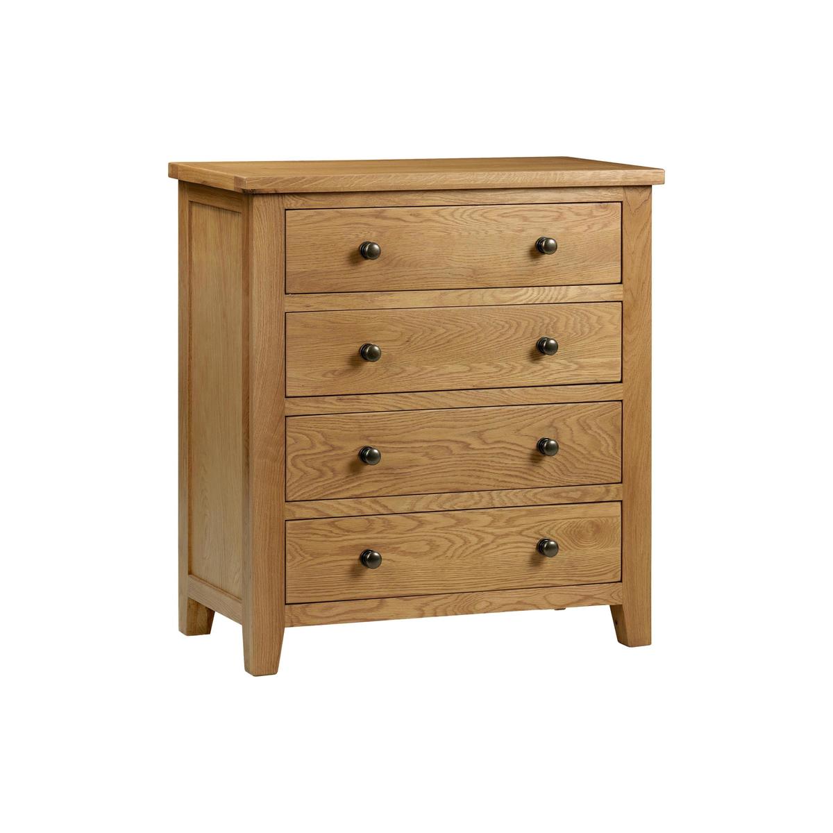 The Addison collection brings beautifully made, classically styled bedroom furniture crafted from solid American white oak with oak veneers. Clean lines, overhanging tops and simple paneled doors, with metal door and drawer handles give this furniture a quiet charm. A wax finish brings out the natural beauty of the wood. Furniture to be enjoyed for years to come. This is a self-assembly item. Classic, well-made oak furniture that always feels at home. Chest has four good-sized drawers with round, metal handles. Crafted from solid white American oak and oak veneers. Chunky, overhanging top and tapered feet. Stylish inset end panels. Clean lines and squared edges for a robust feel. Beautifully finished with a wax coating. WARNING!. Furniture can tip over unexpectedly and cause injury. This item shall be fixed to a wall using the anti-tip kit provided with the furniture. Be sure to use the correct wall fixings suitable for the walls in your home.