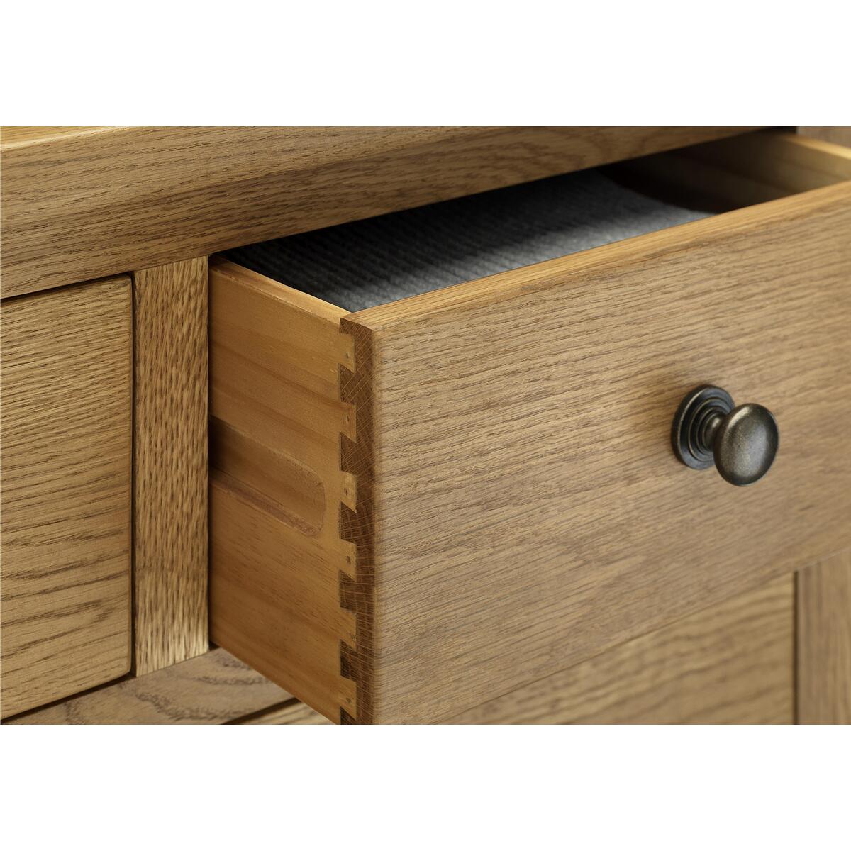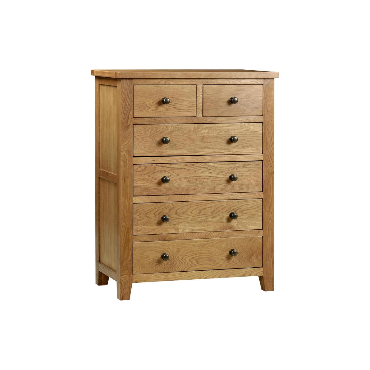 The Addison collection brings beautifully made, classically styled bedroom furniture crafted from solid American white oak with oak veneers. Clean lines, overhanging tops and simple paneled doors, with metal door and drawer handles give this furniture a quiet charm. A wax finish brings out the natural beauty of the wood. Furniture to be enjoyed for years to come. This is a self-assembly item. Classic, well-made oak furniture that always feels at home. Chest has four larger drawers and two smaller ones. Crafted from solid white American oak and oak veneers. Chunky, overhanging top and tapered feet. Stylish inset end panels and round, metal drawer handles. Clean lines and squared edges for a robust feel. Beautifully finished with a wax coating. WARNING!. Furniture can tip over unexpectedly and cause injury. This item shall be fixed to a wall using the anti-tip kit provided with the furniture. Be sure to use the correct wall fixings suitable for the walls in your home.