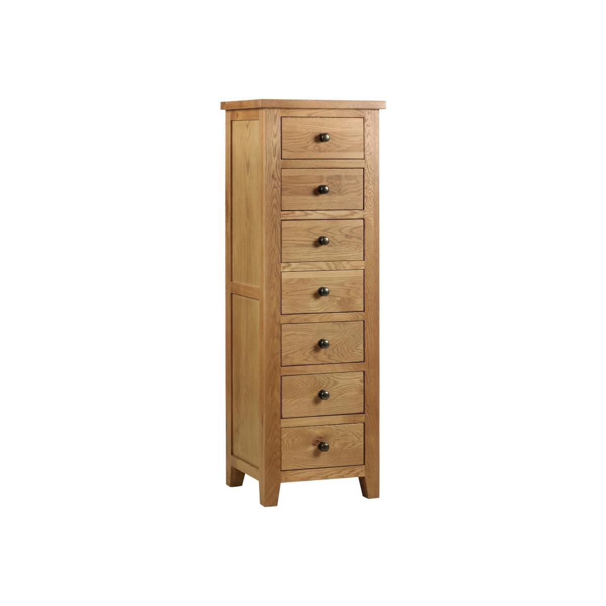 The Addison collection brings beautifully made, classically styled bedroom furniture crafted from solid American white oak with oak veneers. Clean lines, overhanging tops and simple paneled doors, with metal door and drawer handles give this furniture a quiet charm. A wax finish brings out the natural beauty of the wood. Furniture to be enjoyed for years to come. This is a self-assembly item. Classic, well-made oak furniture that always feels at home. Tall chest has seven stacked drawers. Crafted from solid white American oak and oak veneers. Chunky, overhanging top and tapered feet. Stylish inset end panels and round, metal drawer handles. Clean lines and squared edges for a robust feel. Beautifully finished with a wax coating. WARNING!. Furniture can tip over unexpectedly and cause injury. This item shall be fixed to a wall using the anti-tip kit provided with the furniture. Be sure to use the correct wall fixings suitable for the walls in your home.