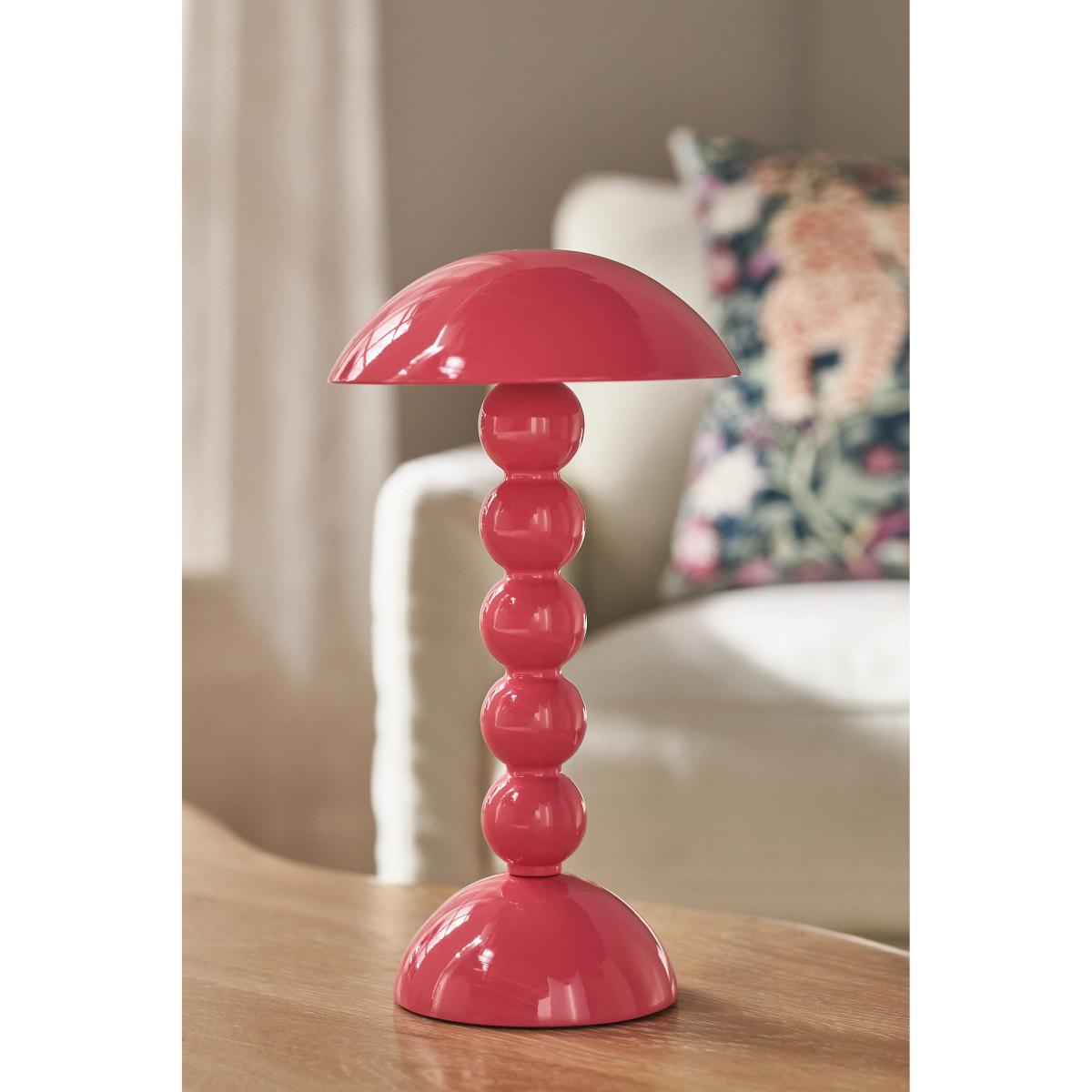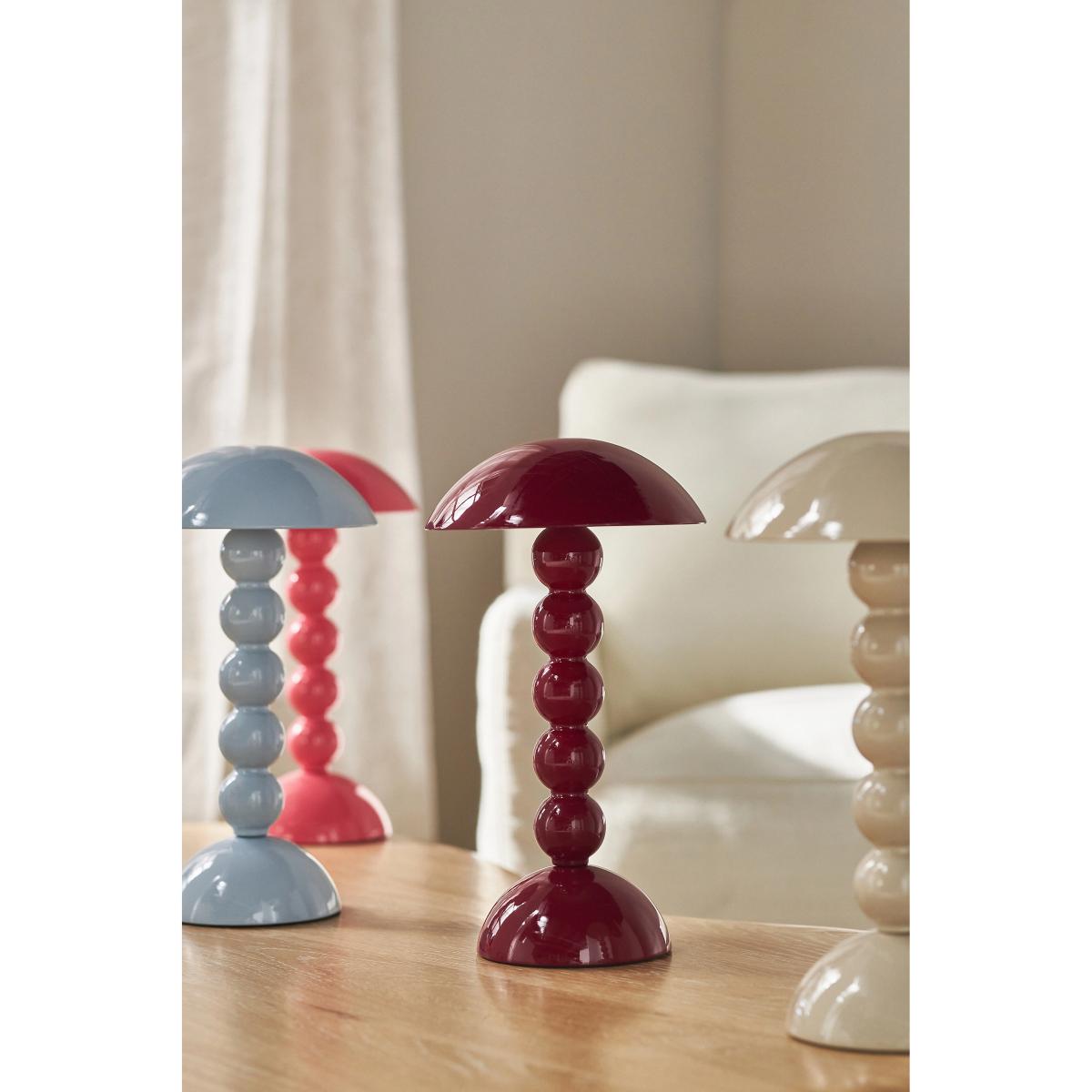 The Bobbin Rechargeable Portable Lamp features a glossy, orb-stacked base with a mushroom shade, bringing cosy chic to your space. *This item is CE listed, meaning it has been tested and approved to meet the government-regulated safety standards for the UK. Use with electrical outlets of 230v or lower, as anything higher can cause fire or injury. If you're purchasing this item for use outside of the United Kingdom, employ the adapter and voltage converter suited for your country* * By Addison Ross * MDF coated with lacquer * Portable * Shade attached * Rechargeable; USB-USB C charging cable included * Approximately 10-hour battery life on the brightest of three settings * The battery is capable of handling up to 1,200 full charges before it may begin to lose capacity, resulting in fewer hours of use before requiring a recharge * Battery lasts for 10 years with a reasonable amount of use * Three light settings * LED bulb * Includes gift box * CE listed * Imported **How To Use:** * Tap the button on the top to activate the LED Lamp.
