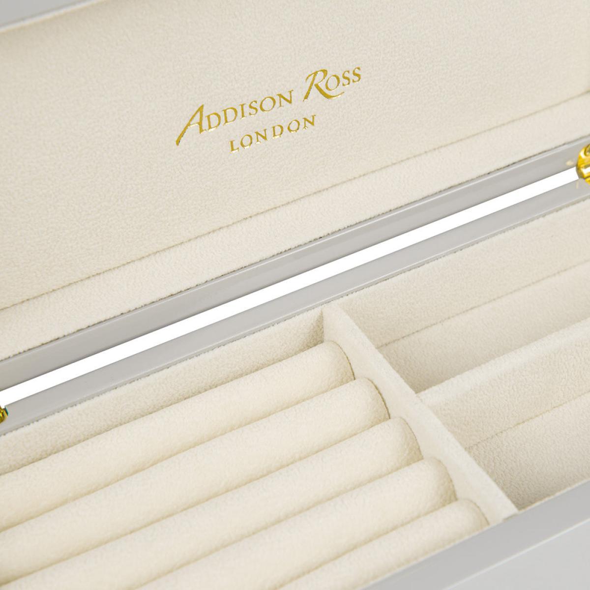 What will you keep in this box from Addison Ross? Made from lacquer, this glossy box has been finished with metallic accents and a suede interior. Pair with more accessories from Addison Ross to complete the look.