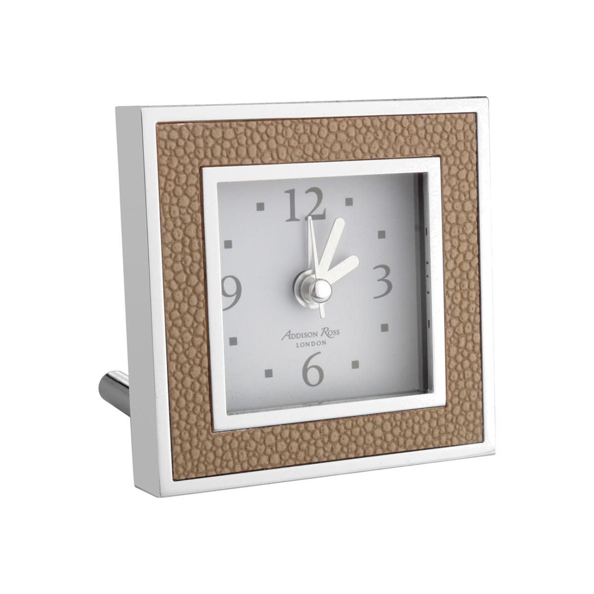 Arise each morning in style with this elegant alarm clock from Addison Ross. With a simple clock face and alarm function, this clock is a bedside table must-have and is adorned with a chic contrasting frame in a selection of materials and colours. Edged with silver plating, it is a wonderful gift idea for busy people. Key features: * Luxury alarm clock * Material: faux shagreen, silver plating * Dimensions: 8x8cm * Battery required: 1 x AA (not included) * Taupe faux shagreen frame * Finished with silver plated edging * Alarm clock function * Small arm stand * Presented in a luxury Addison Ross gift box