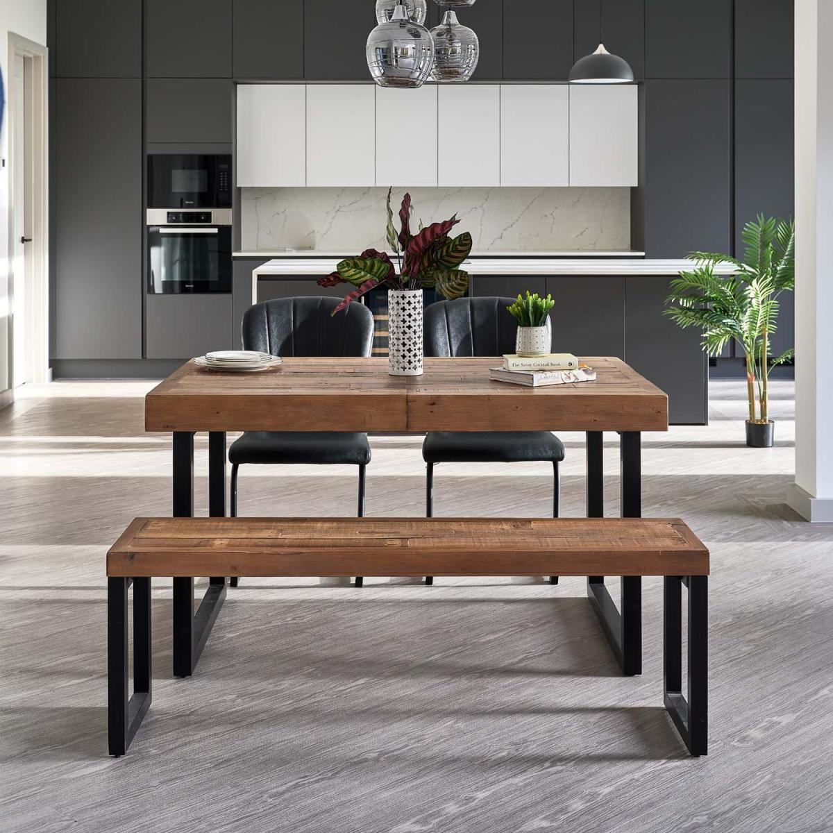 This Adelaide and Firenza dining set allows you to seat the whole family in comfort and style! The reclaimed wood table top brings an industrial look to any dining room, offering a natural and sustainable option that pairs perfectly with the matching bench. The sleek Firenza faux leather dining chairs in black keep the room feeling timeless yet modern, and provide back support while the flat wooden bench ensures you can fit more people around the extended form of the dining table.