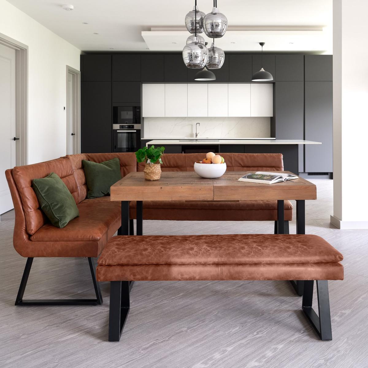 This Adelaide and Industrial dining set allows you to seat the whole family in comfort and style! The reclaimed wood table top brings an industrial look to any dining space, offering a natural and sustainable option. The practical yet stylish Industrial Corner Bench in tan is the perfect solution for seating more people and goes perfectly with the stunning extending dining table. Adding the matching flat bench gives you even more space to host extra guests and is light and easy to move to the hallway or another room if you don't need it in the dining room all the time, making this set all the more flexible and versatile!.