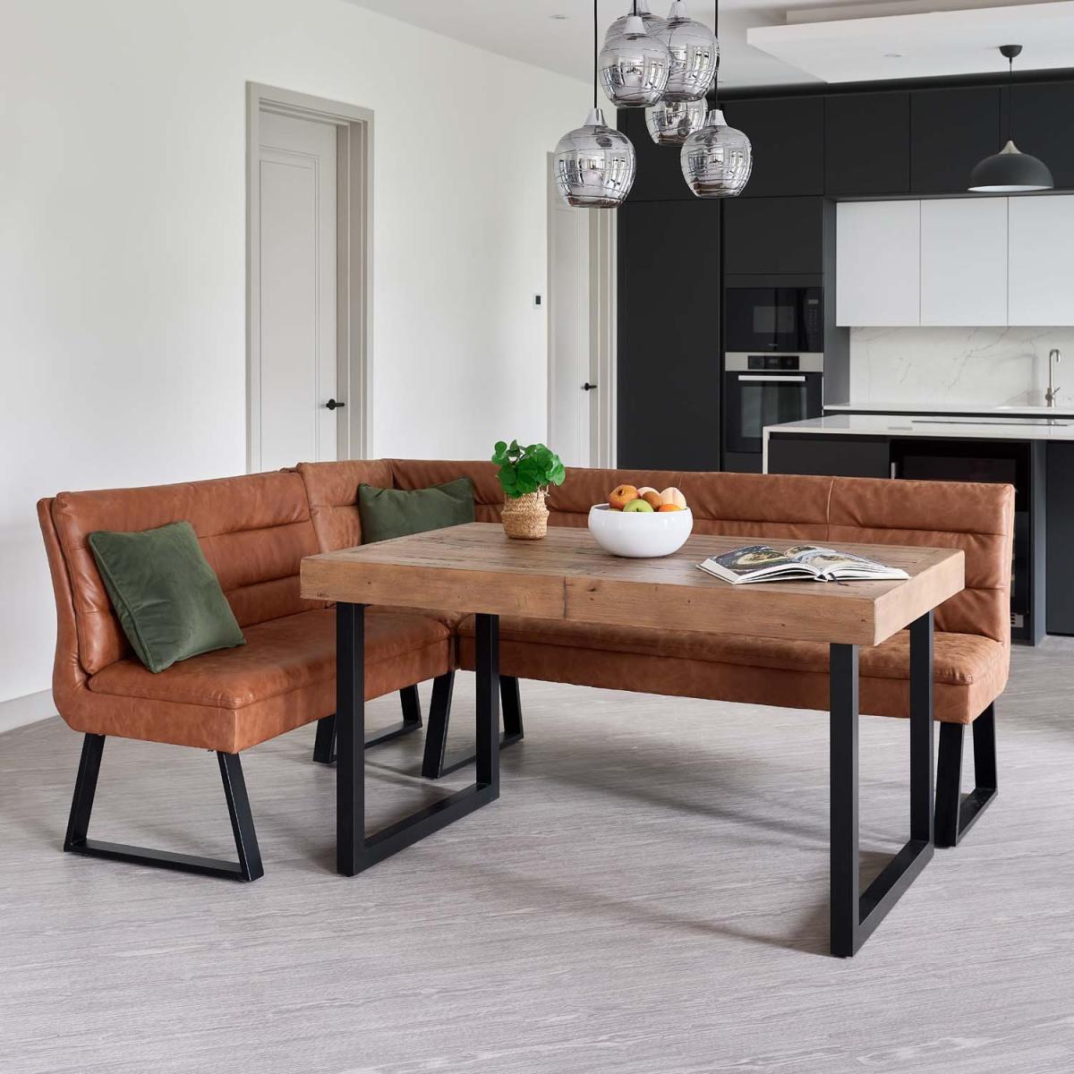 This Adelaide and Industrial dining set allows you to seat the whole family in comfort and style! The reclaimed wood table top brings an industrial look to any dining room, offering a natural and sustainable option. The practical yet stylish Industrial Corner Bench in tan is the perfect solution for seating more people and goes perfectly with the stunning extending dining table.