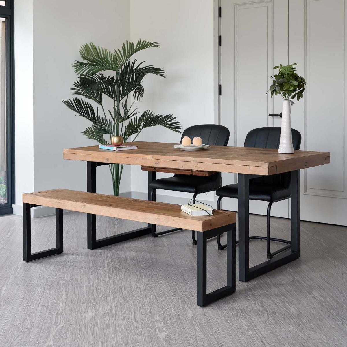 This Adelaide and Firenza dining set allows you to seat the whole family in comfort and style! The reclaimed wood table top brings an industrial look to any dining room, offering a natural and sustainable option that pairs perfectly with the matching bench. The sleek Firenza faux leather dining chairs in black keep the room feeling timeless yet modern, and provide back support while the flat wooden bench ensures you can fit more people around the extended form of the dining table.