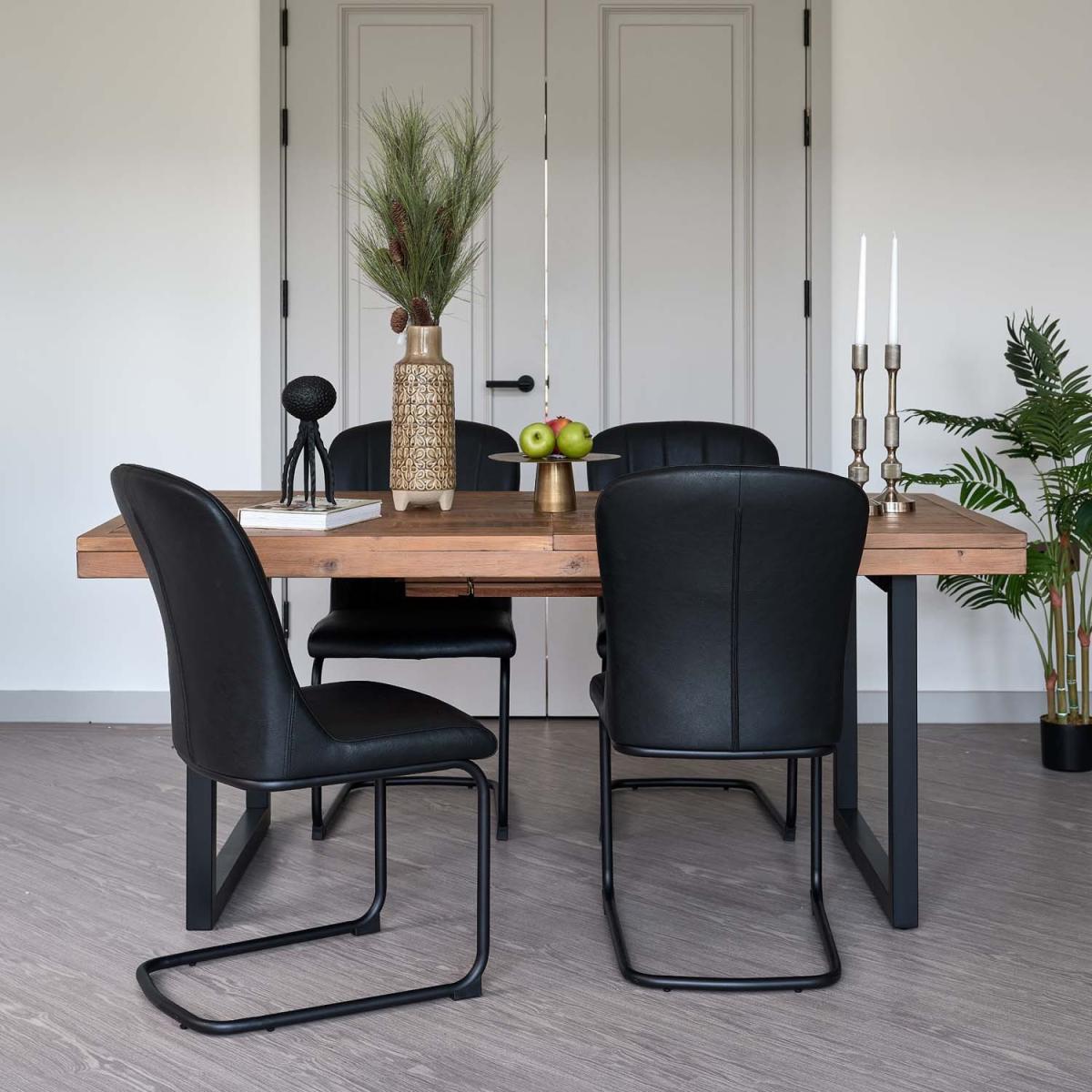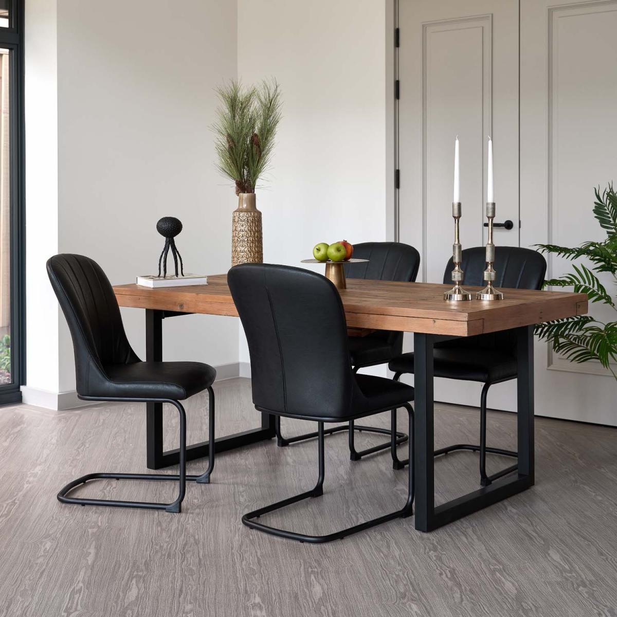 This Adelaide and Firenza dining set allows you to seat the whole family in comfort and style! The reclaimed wood table top brings an industrial look to any dining room, offering a natural and sustainable option. The sleek Firenza faux leather dining chairs in black keep the room feeling timeless yet modern, and provide the perfect complement to this stunning extending dining table.