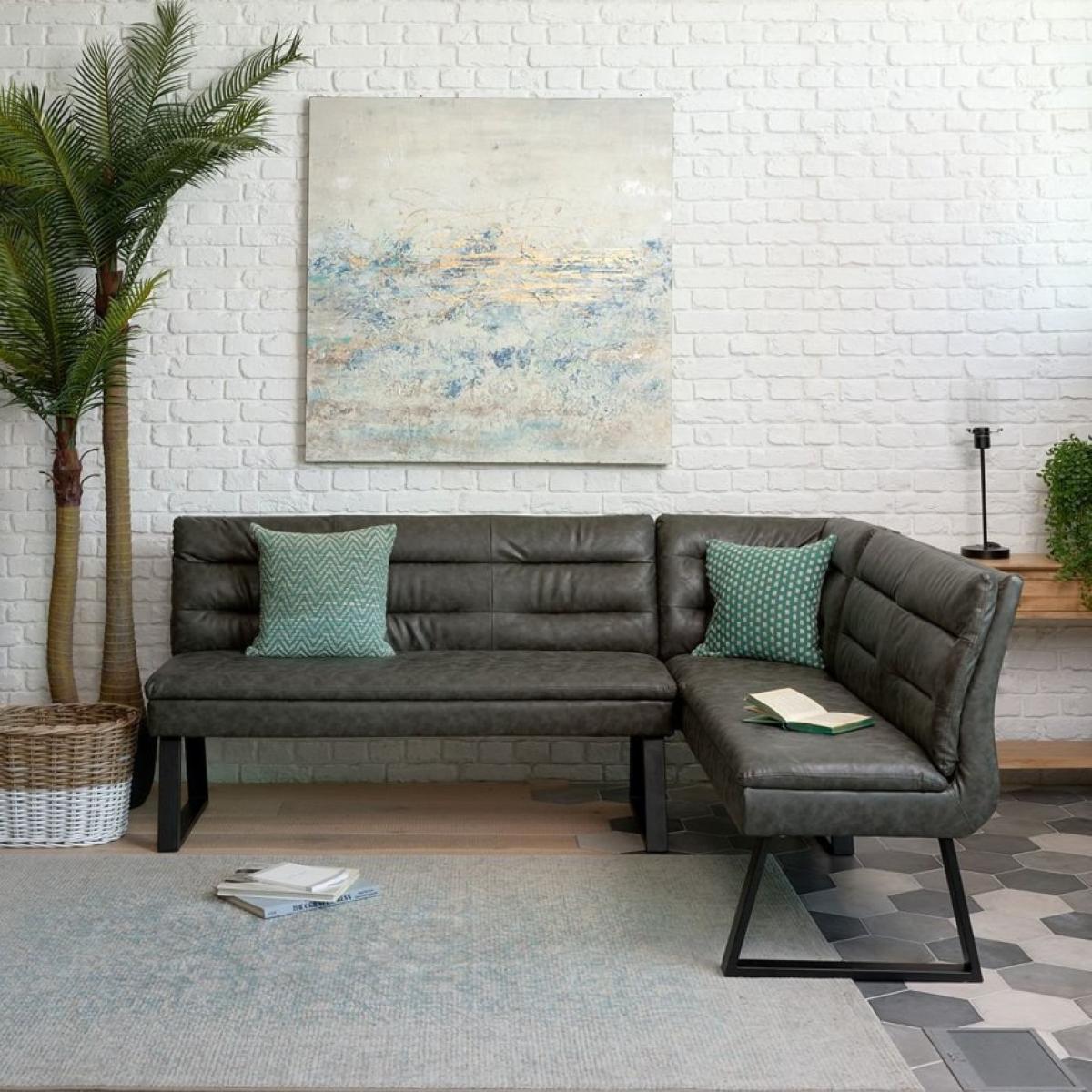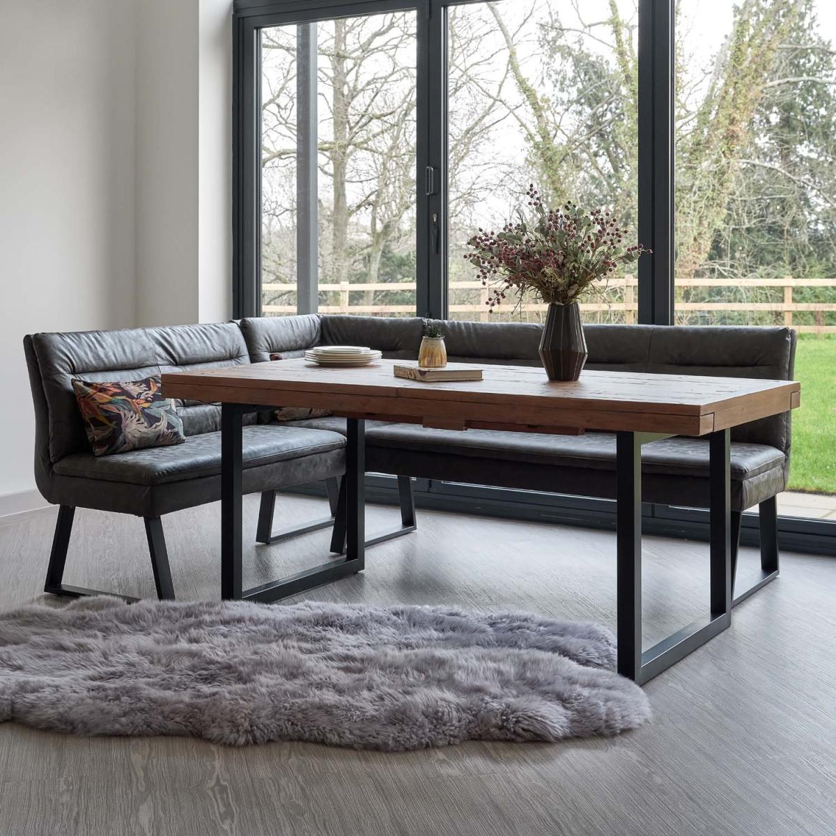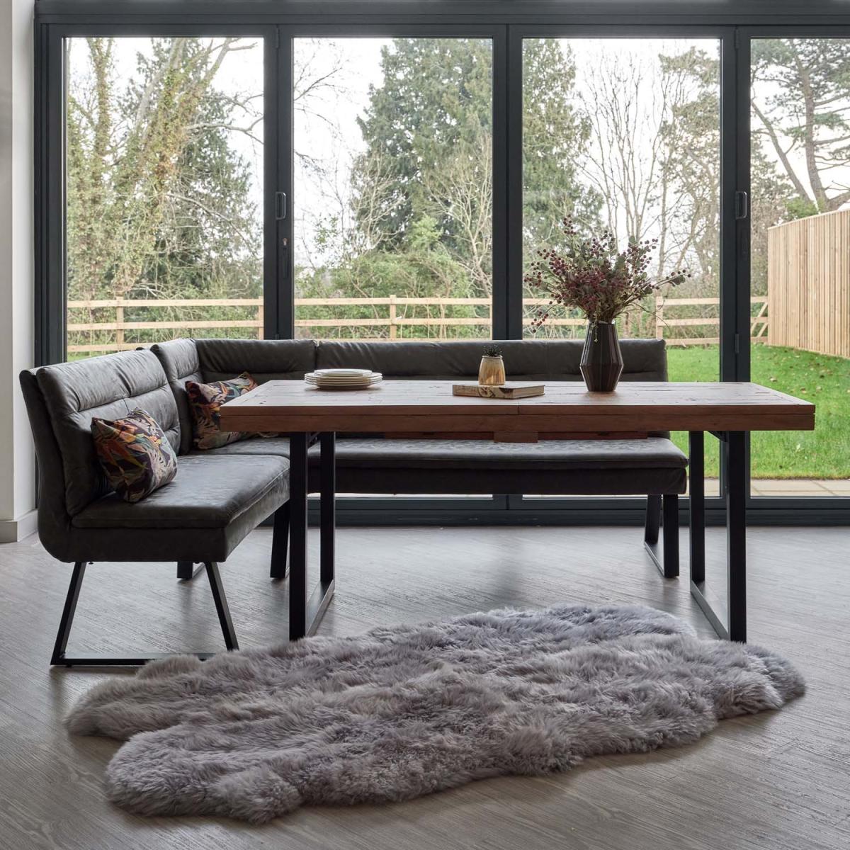 This Adelaide and Industrial dining set allows you to seat the whole family in comfort and style! The reclaimed wood table top brings an industrial look to any dining room, offering a natural and sustainable option. The practical yet stylish Industrial Corner Bench in grey is the perfect solution for seating more people and goes perfectly with the stunning extending dining table.