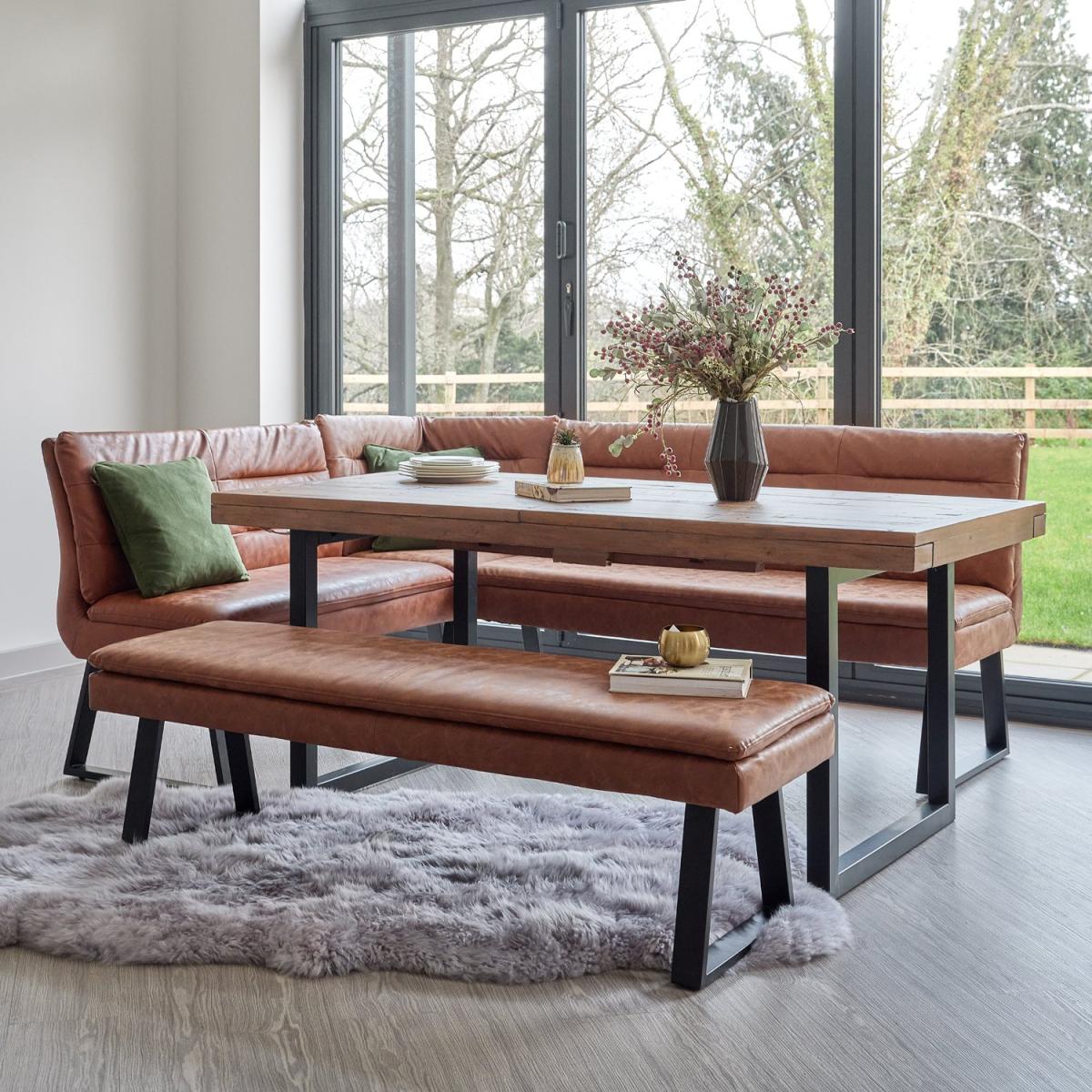 This Adelaide and Industrial dining set allows you to seat the whole family in comfort and style! The reclaimed wood table top brings an industrial look to any dining space, offering a natural and sustainable option. The practical yet stylish Industrial Corner Bench in tan is the perfect solution for seating more people and goes perfectly with the stunning extending dining table. Adding the matching flat bench gives you even more space to host extra guests and is light and easy to move to the hallway or another room if you don't need it in the dining room all the time, making this set all the more flexible and versatile!.