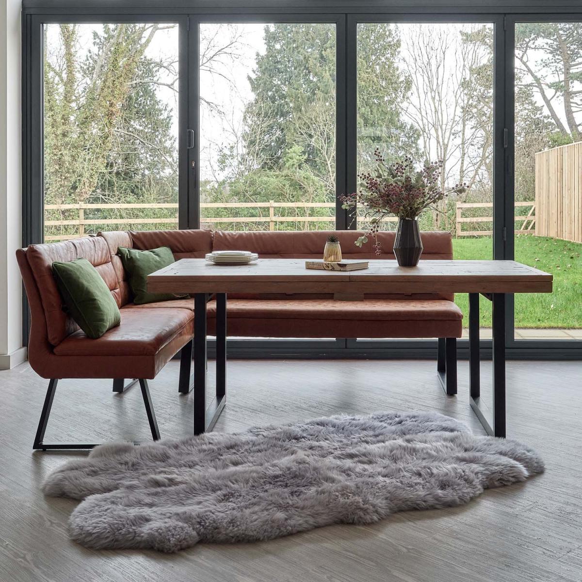 This Adelaide and Industrial dining set allows you to seat the whole family in comfort and style! The reclaimed wood table top brings an industrial look to any dining room, offering a natural and sustainable option. The practical yet stylish Industrial Corner Bench in tan is the perfect solution for seating more people and goes perfectly with the stunning extending dining table.