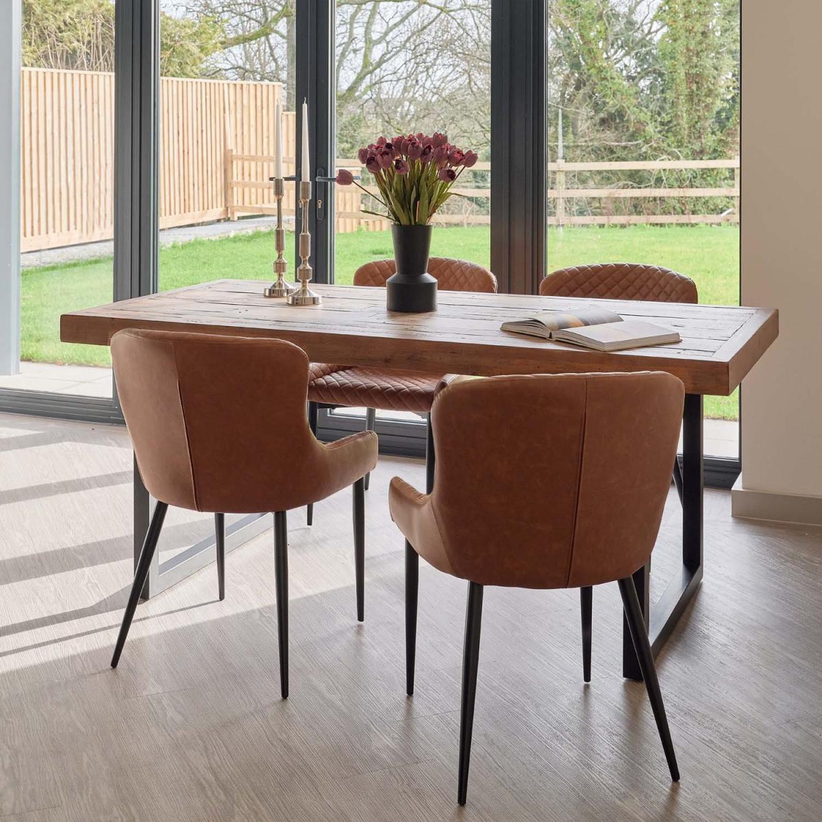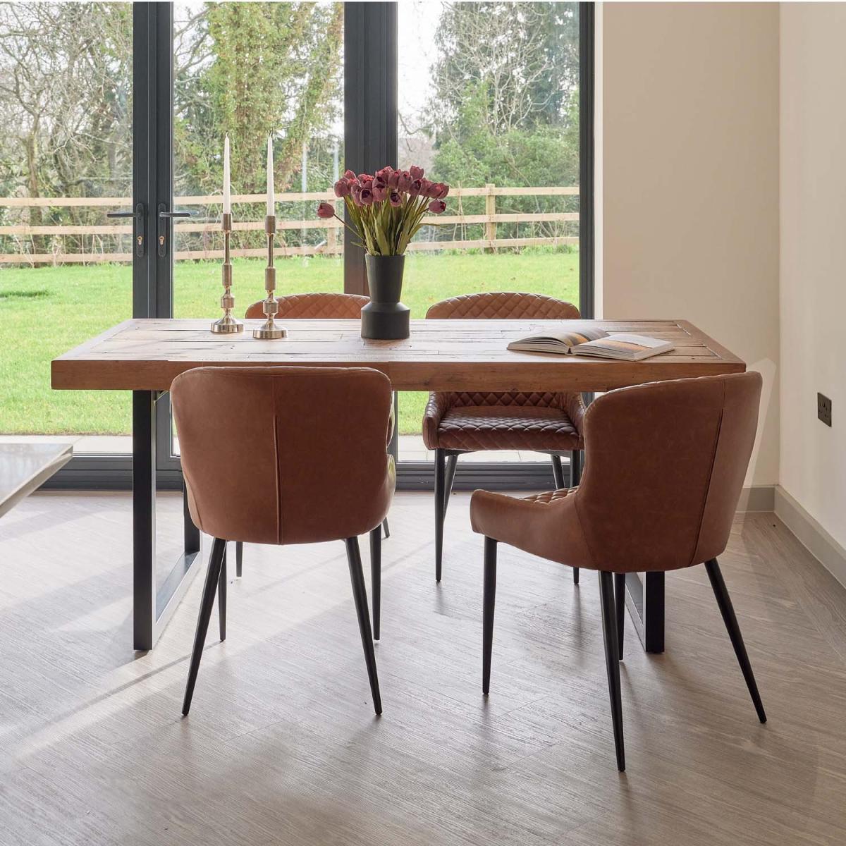 This Adelaide and Carlton dining set allows you to seat the whole family in comfort and style! The reclaimed wood table top brings an industrial look to your dining room, offering a natural and sustainable option that is effortlessly complemented by the modern Carlton chairs. Combining diamond quilted upholstery with stunning matte black coated metal legs, this seating option effortlessly showcases the marriage of traditional and contemporary styles. The curved back provides an added level of support and comfort while the tan faux leather gives these chairs a refined feel, a perfect addition to any dining room, making them the ideal companion for this beautiful fixed top table.