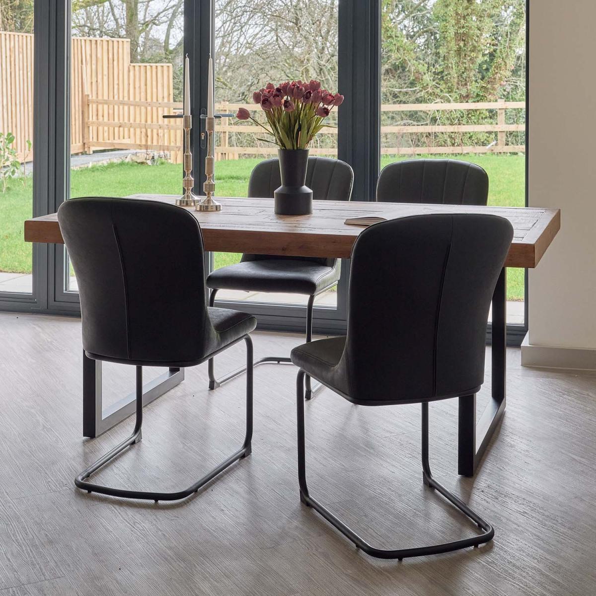 This Adelaide and Firenza dining set allows you to seat the whole family in comfort and style! The reclaimed wood table top brings an industrial look to any dining room, offering a natural and sustainable option. The sleek Firenza faux leather dining chairs in black keep the room feeling timeless yet modern, and provide the perfect complement to this stunning fixed top dining table.