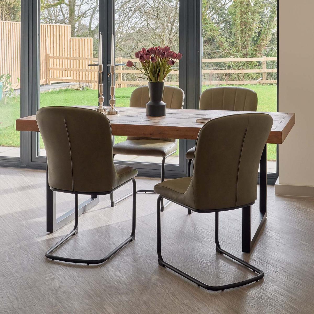 This Adelaide and Firenza dining set allows you to seat the whole family in comfort and style! The reclaimed wood table top brings an industrial look to any dining room, offering a natural and sustainable option. The sleek Firenza faux leather dining chairs in olive green keep the room feeling timeless yet modern, and provide the perfect complement to this stunning fixed top dining table.